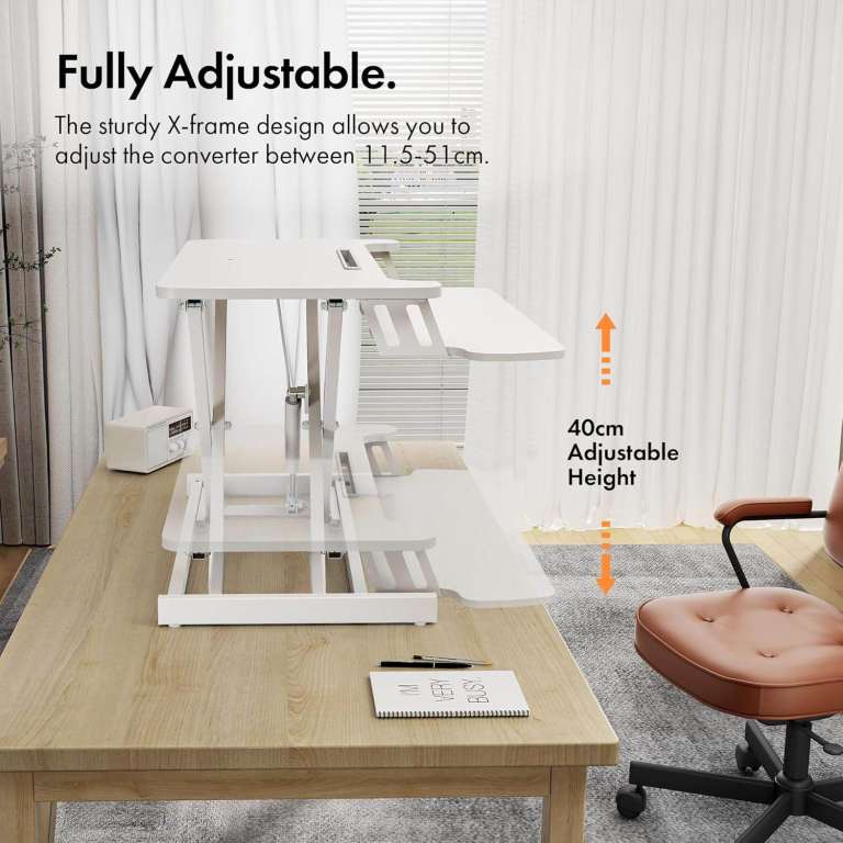 - ENHANCED ERGONOMICS: Increase WFH productivity with the standing desk converter. With a large W80 x D40cm top, tablet slot, and keyboard shelf, create your optimal setup with ease.