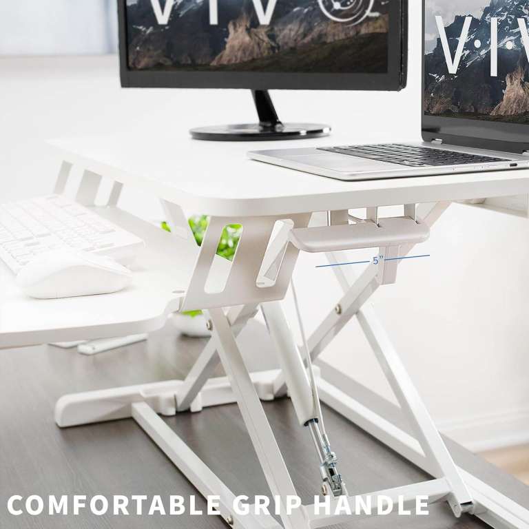 - EASY ADJUSTMENTS: Effortlessly bring your screens to eye level with the easy-squeeze handle. The gas spring ensures smooth adjustment, so you can move your sit stand desk converter between 11.5-51cm in one go.