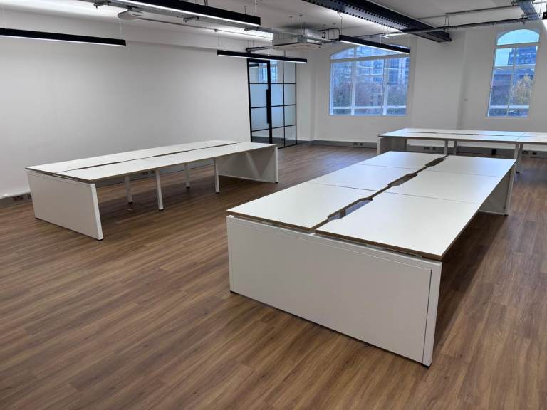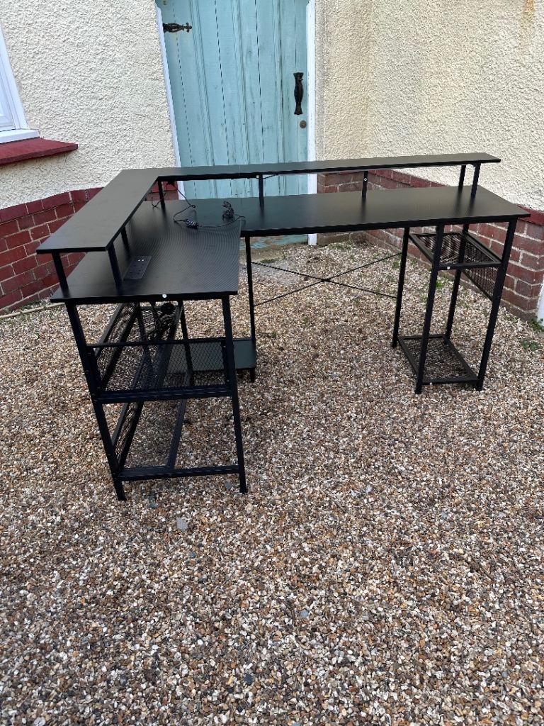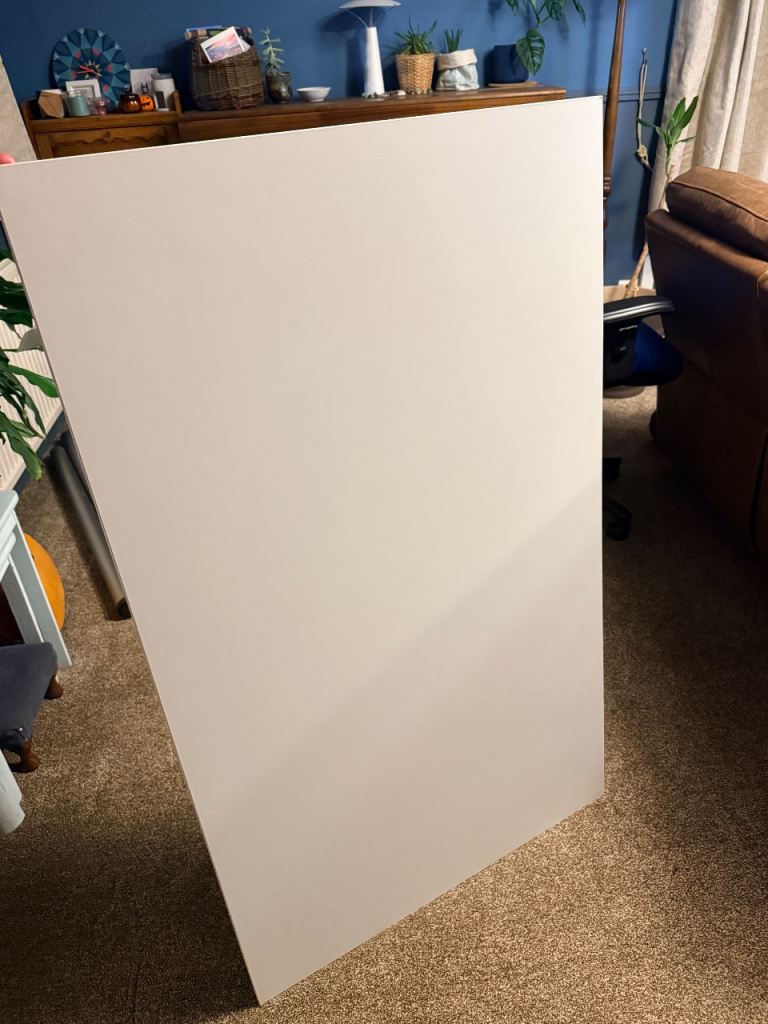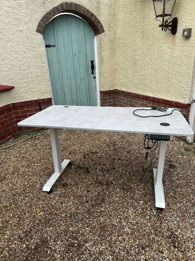 White ikea desk top with silver tall legs. Legs are 109cm in length. Desk top is 125cm by 75cm. Few marks around the edges of the top but pretty decent