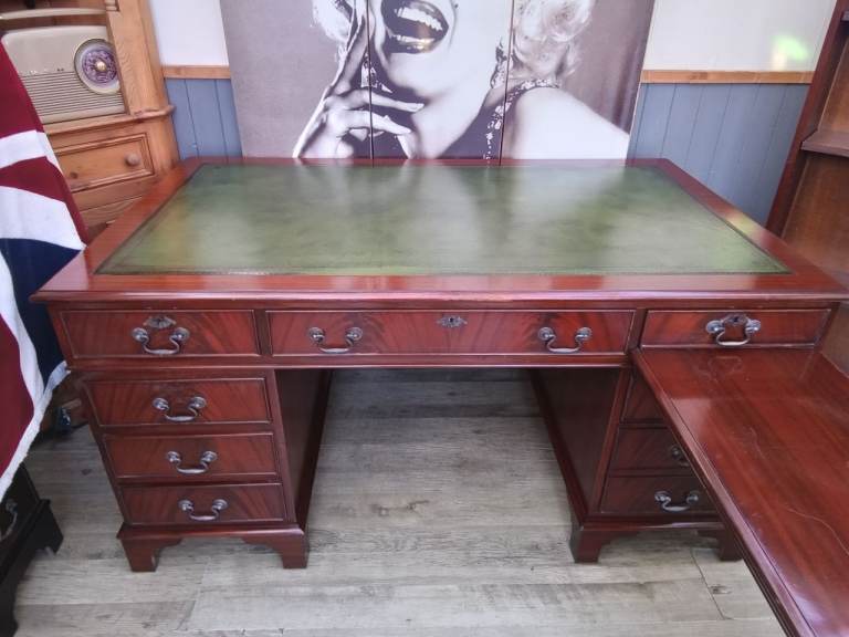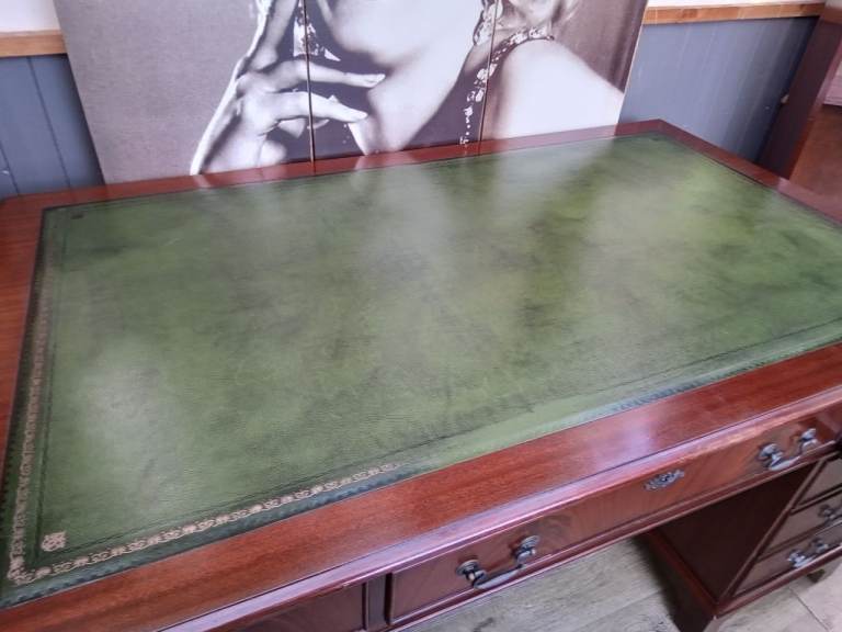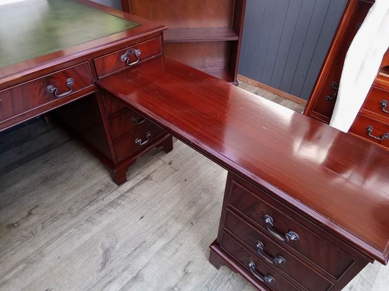 Stunning 5ft Green Leather Inlay L Shaped Desk and Bookcase