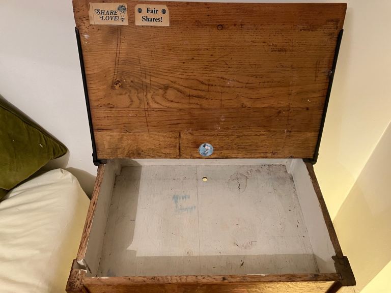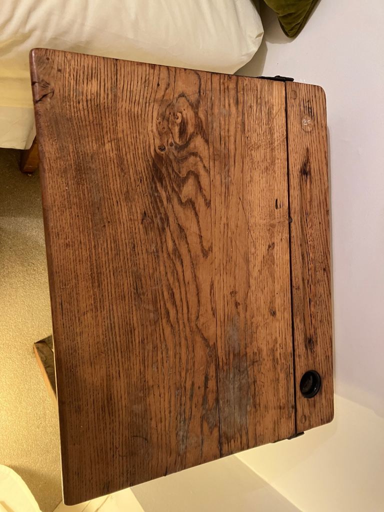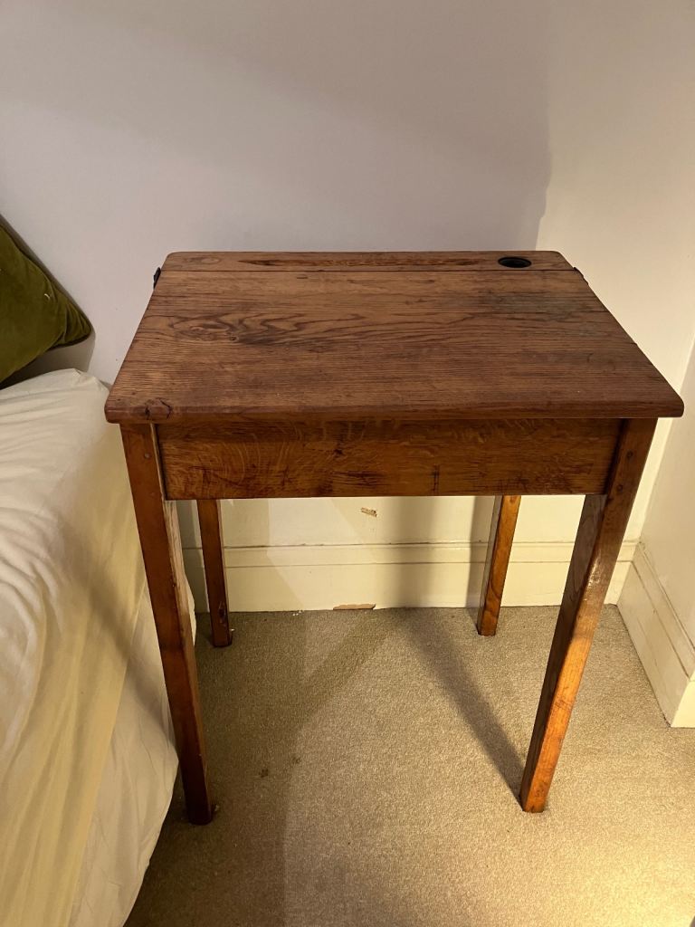 Vintage wooden school desk with fold up lid. Full of character, can be used as desk or currently being used as bedside table. Pet and smoke free home. Collection from West-cliff (or Hammersmith or Brighton with some notice).