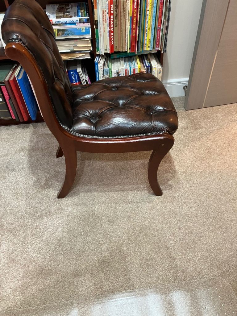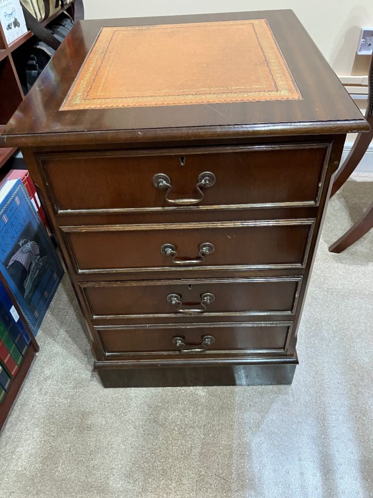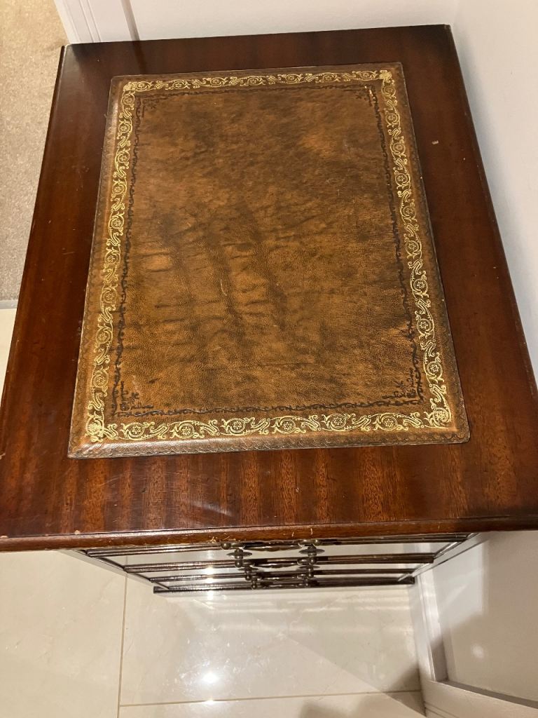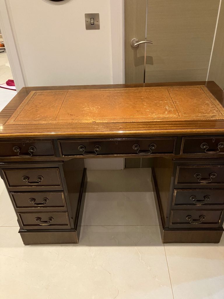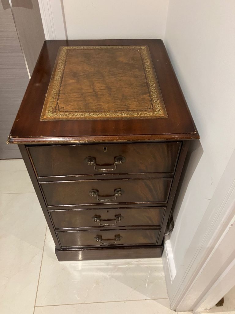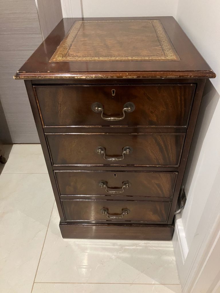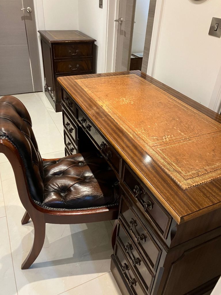 Vintage solid wood with leather insert matching desk, cabinet and chair with extra cabinet.