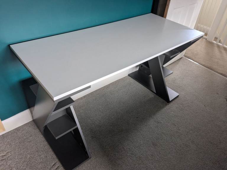 A desk suitable for computers. White top and grey legs. Shelves on the legs.