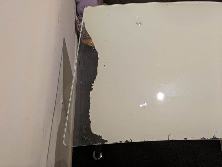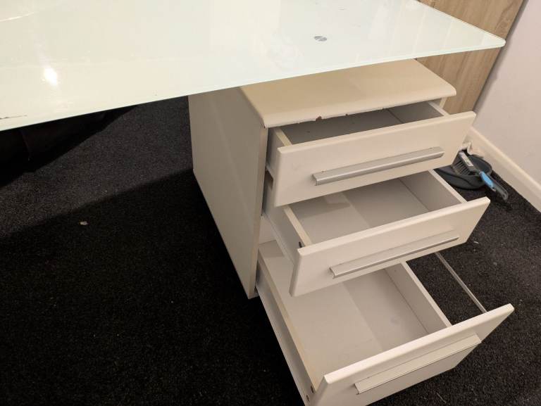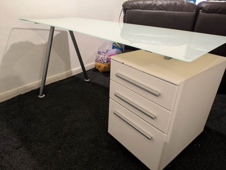 Posting for 10+ yearsWhite Glass Desk with Storage