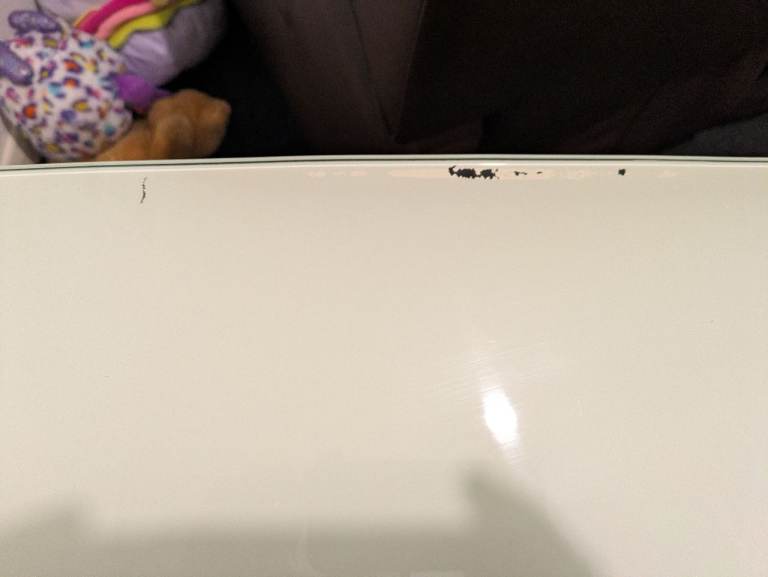 White Glass Desk with Under Desk Storage. 75cm high, 150cm wide, and 60-80cm depth as curved.