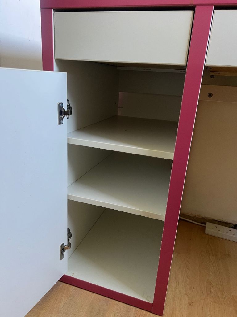 Has a whiteboard attached, bookshelf, draws and shelves