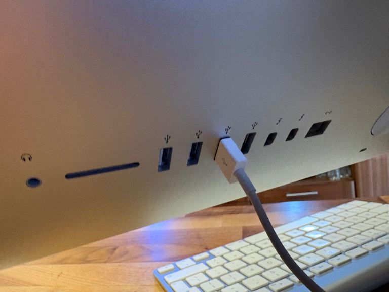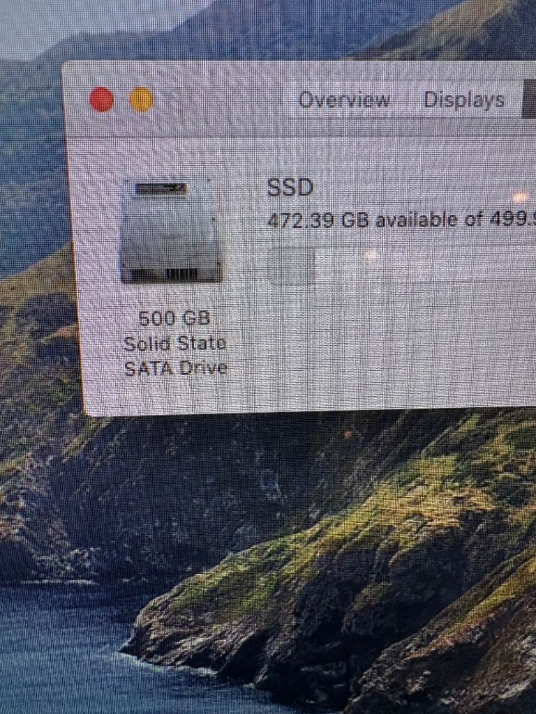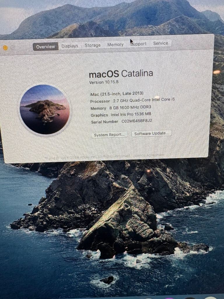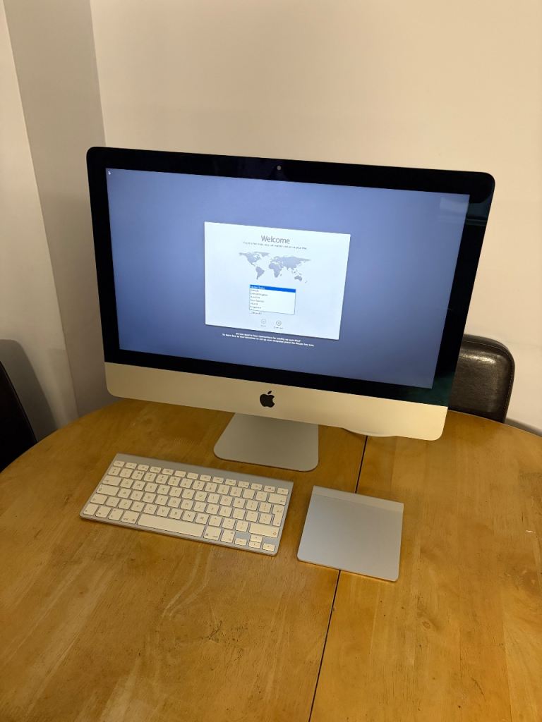 Apple iMac 21.5-inch, Late 2013 Processor 2.7GHz Quad-Core Intel Core i5, 8GB Ram, 500HB SSD, macOS Catalina, Bluetooth keyboard and mouse, power cable.