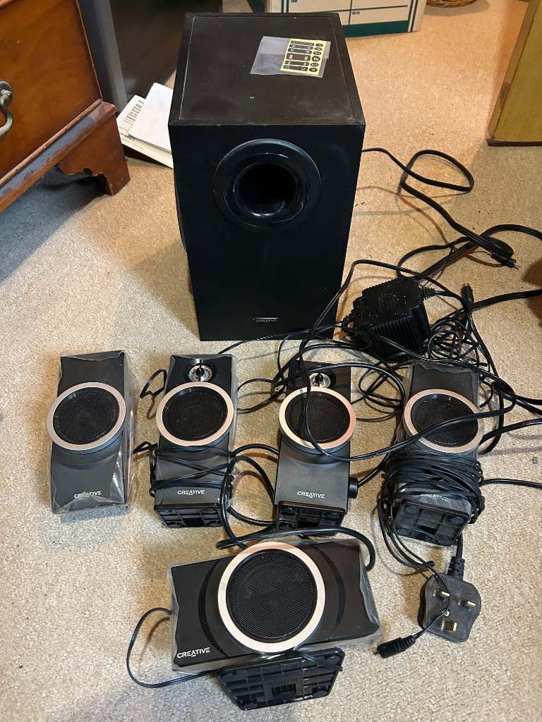 A Creative PC surround sound system for a PC. 2 front, 2 rear and sub woofer speakers. Mains powered. With all leads. Collect from SA43