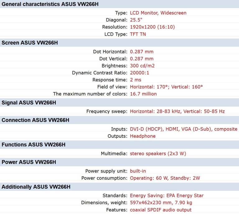 25.5" Asus VW266H 1920 x 1200 WUXGA Monitor