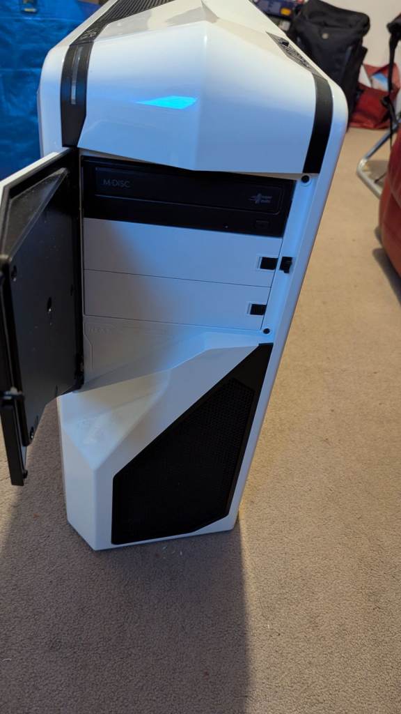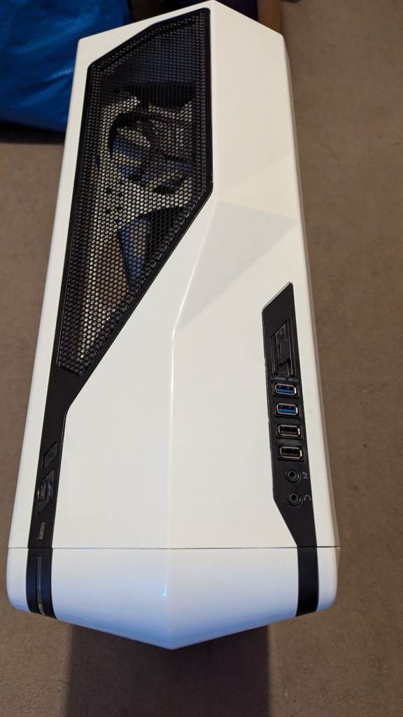 White minitower desktop PC with glass side panel and blue LED lighting. Fully working and ready to use.