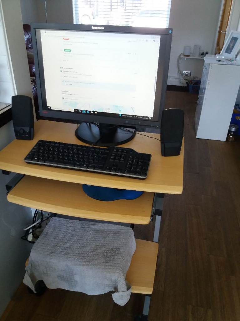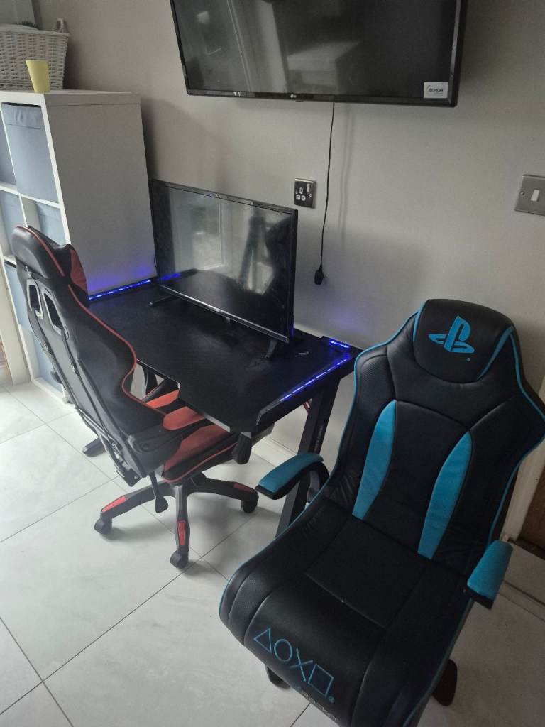 Gaming desk, TV and two swivel chairs. All in very good condition. Selling due to computer set up on big TV. Can't find remote but only few quid. Can be seen working. Any questions please ask.