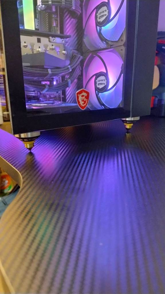 Gamemax Infinity case is a modern case style upgraded for better airflow and looks...inside has carbon fibre look and a 5 inch PC system monitor screen to keep an eye on live pc monitoring or can be customised with included software to create your own custom layout or video... has brass/chrome spiked feet fitted giving better bottom airflow, good looks and anti vibration, comes with black platform to allow floor placement without dust from carpets etc getting directly into the case keeping it dust free for longer.