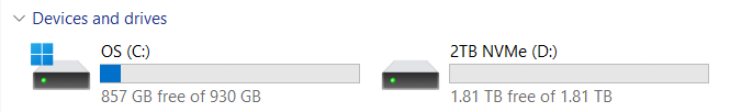 NVMe: Samsung 1TB NVMe (OS) Corsair 2TB NVMe (Games/Data)