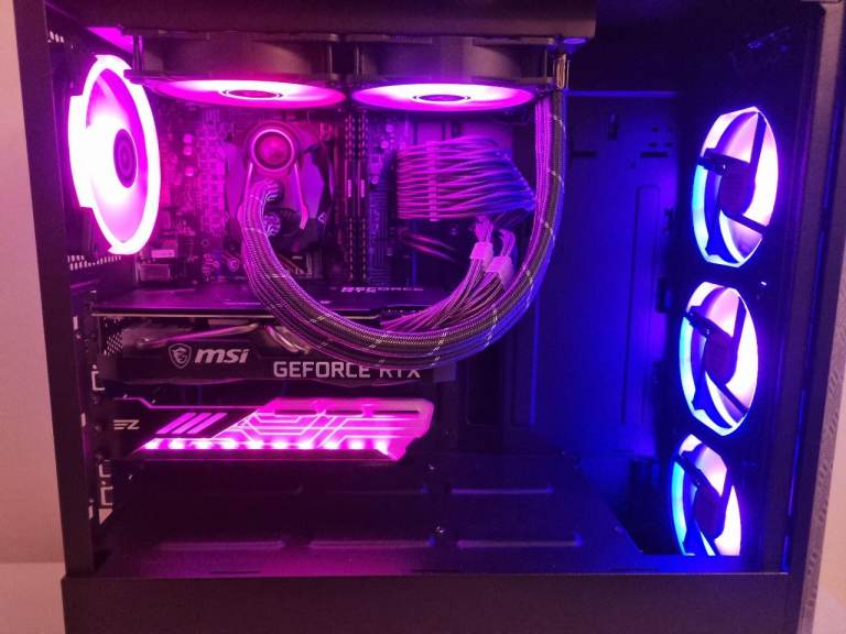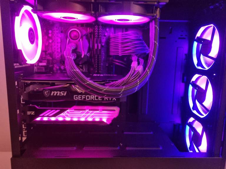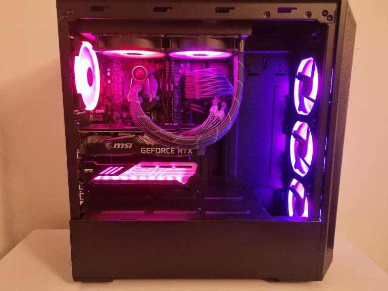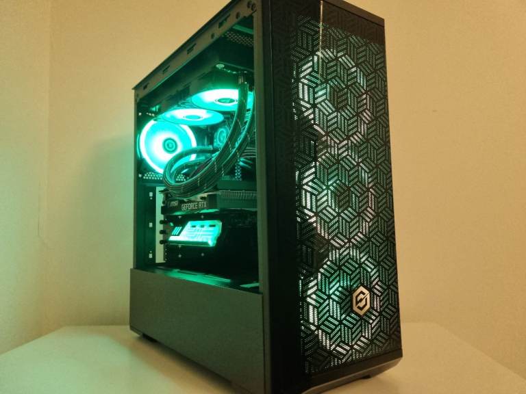 The PC is efficiently cooled using a 240mm Arctic liquid AIO, ensuring low temperatures and quiet operation, and is housed in a Cooler Master RGB gaming case with full Razer Chroma RGB control for a premium look.