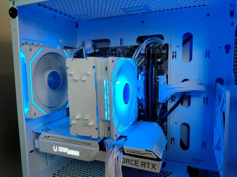 Case - CiT Volt with tempered glass side panel 2 x cooling fans, RGB rear fan, RGB CPU fan and case front RGB are all connected to a hub and synced. Colours can be altered at the press of a button.