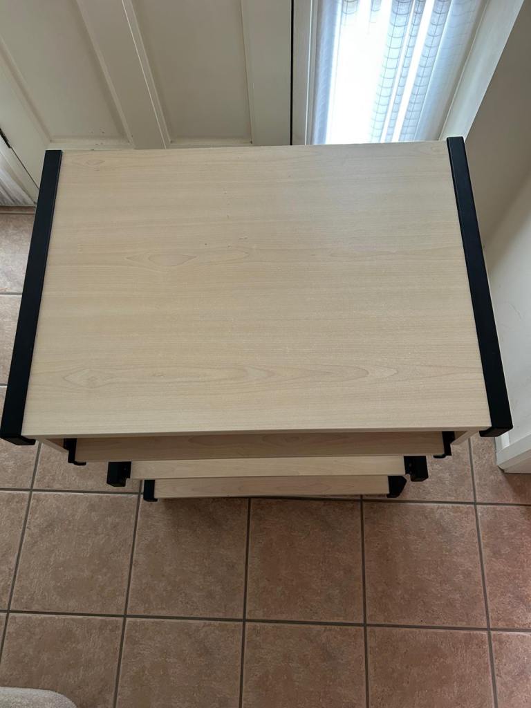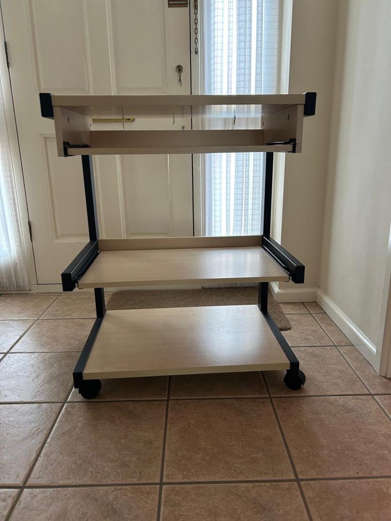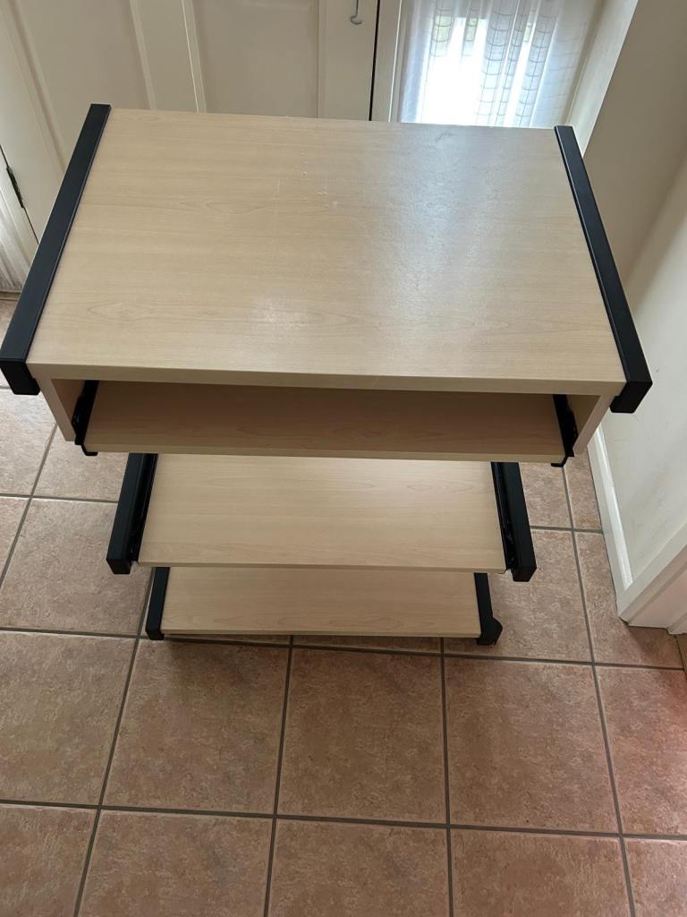 Great condition table for PC with keyboard tray. Has wheels easily moveable