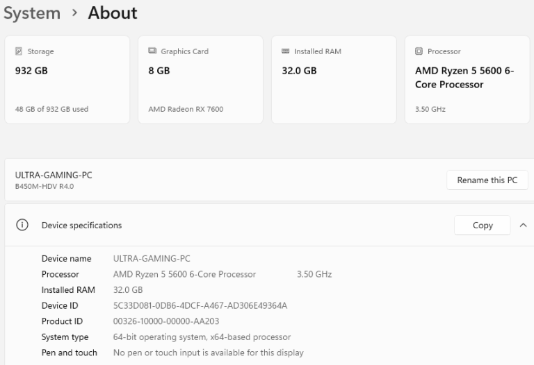 The AMD Radeon RX 7600 8GB graphics card allows smooth performance in modern games and supports up to 4 screens. The Ryzen 5 5600 6 core 12 thread processor delivers excellent gaming performance together with strong productivity and multitasking capabilities.