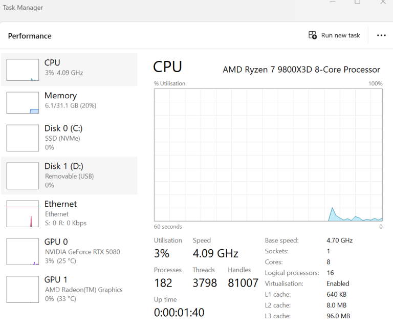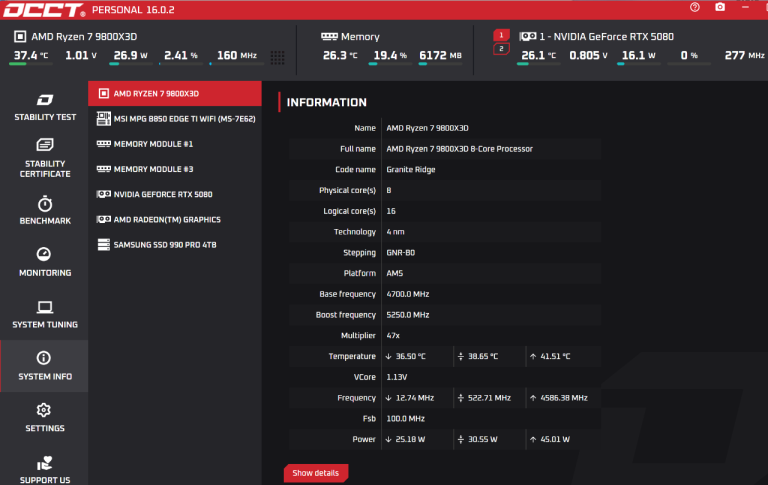 Processor: AMD Ryzen 7 9800X3D- Up to 5.2Ghz (8 Cores, 16 Threads)