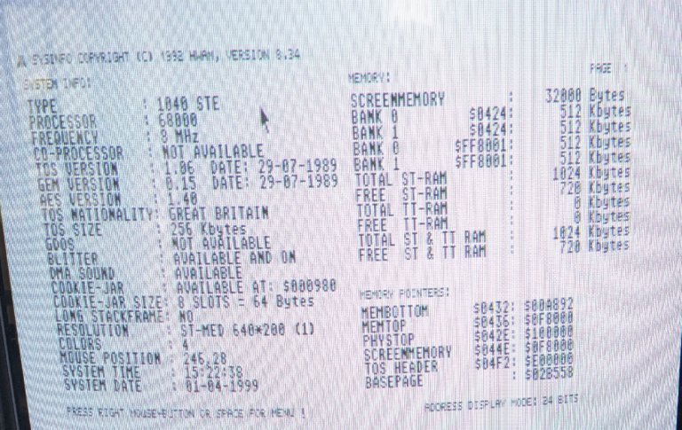 System Information identifies the machine as a 1040STE with 1MB RAM.