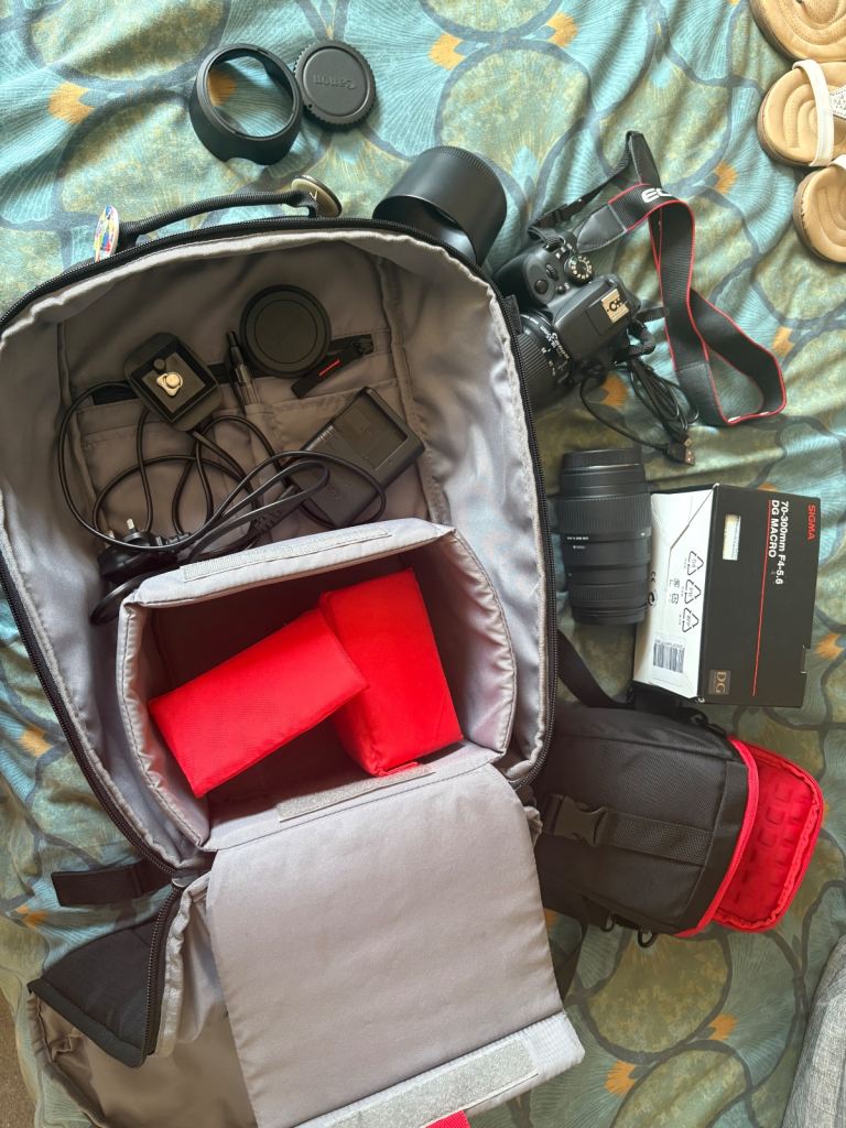 Canon EOS 100D digital camera with original lens plus additional sigma 70 300mm f4 5.6 lens which fits and works with this cannon. Comes with original carry bag all original cables and accessories plus extra backpack and mounting platform for camera. Battery charger in full working order and battery life is excellent. 64gb memory card included. Great starter kit for someone wanting to get into photography