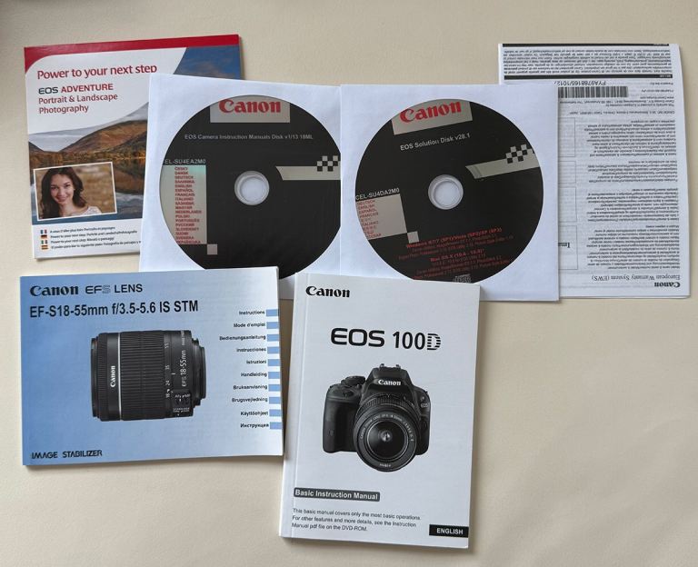 Canon EOS 100d SLR camera body and 18-55mm lens, used, complete with Canon strap, all manuals and discs, one battery pack, one battery, lens caps and box.