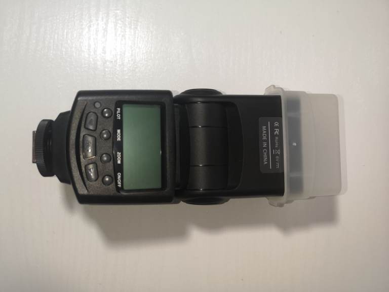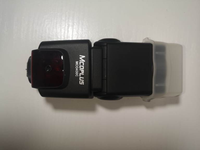 Included is a flash unit (MCOPLUS MCD430C) with a diffuser, and a wired remote control.