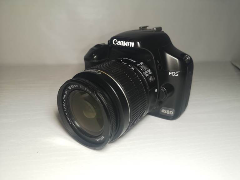 Canon EOS 450D DSLR camera with a 18-55mm lens and lens cap, in perfect condition.