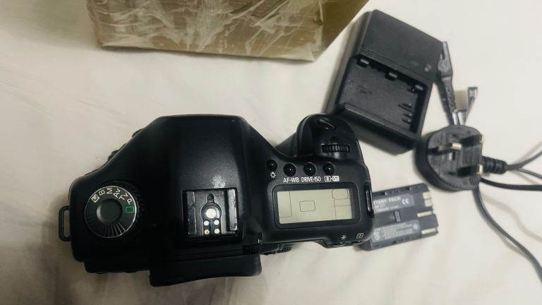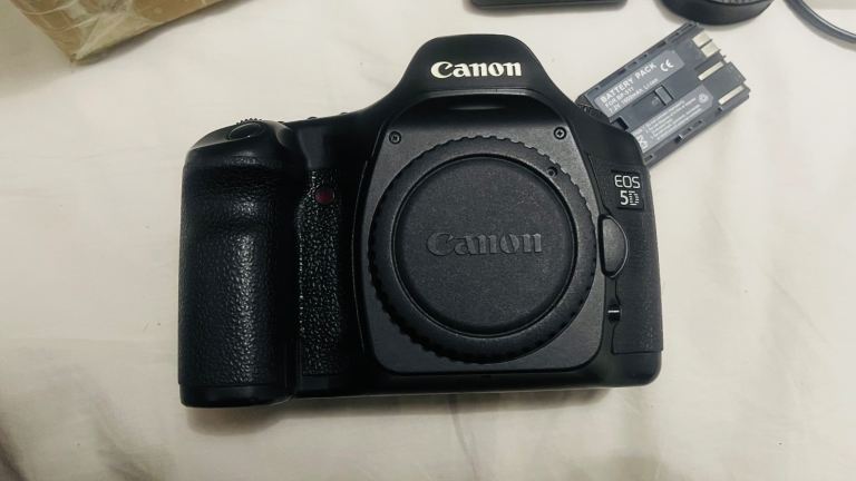 Canon EOS 5D DSLR camera with body cap + charger + battery.