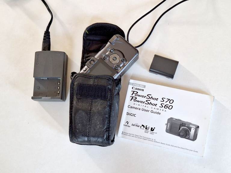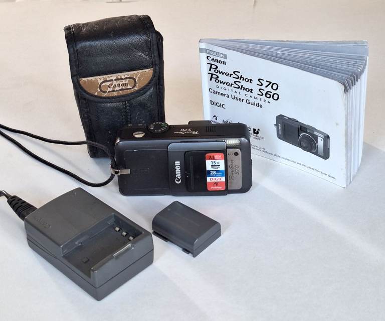 The Canon PowerShot S70 is a 7.1MP digital camera released in late 2004, featuring a 3.6x optical zoom lens (28-100mm equivalent), a 1.8-inch LCD screen, and a CompactFlash card slot for storage. Key specifications include a 1/1.8" CCD sensor, a fast shutter speed range of 15s to 1/2000s, and a RAW file format option for greater editing flexibility.