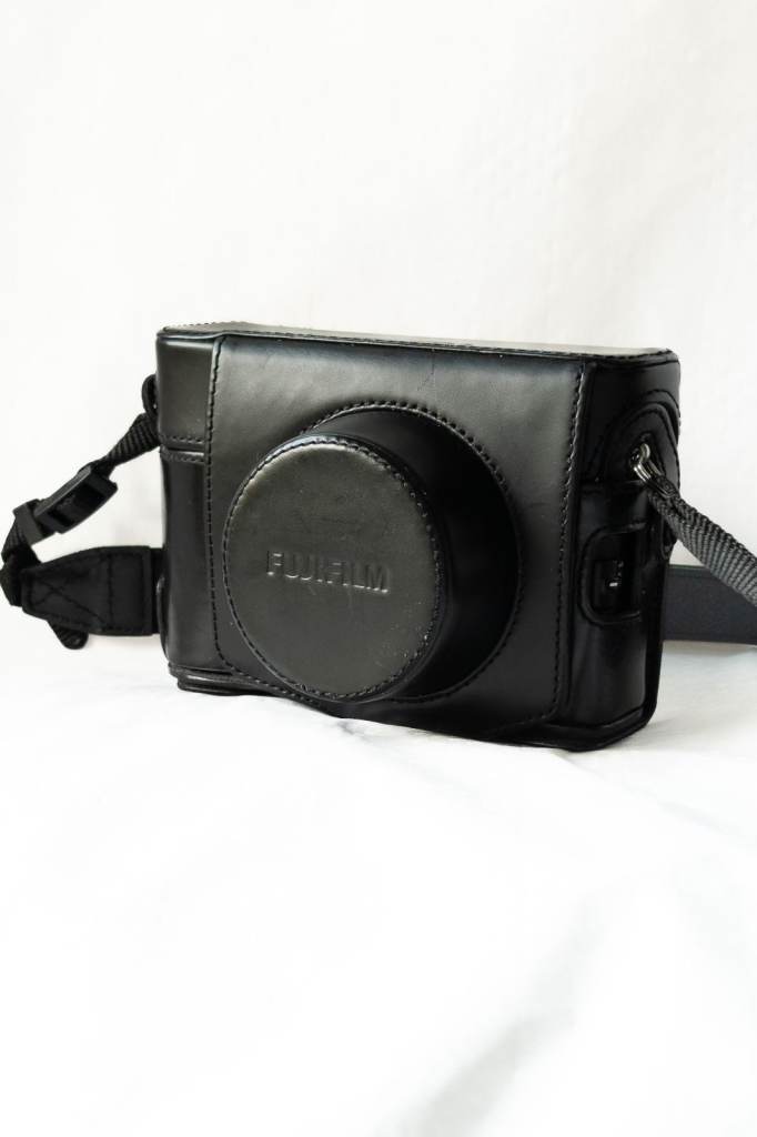 Fujifilm X100F digital camera with leather case for sale.
