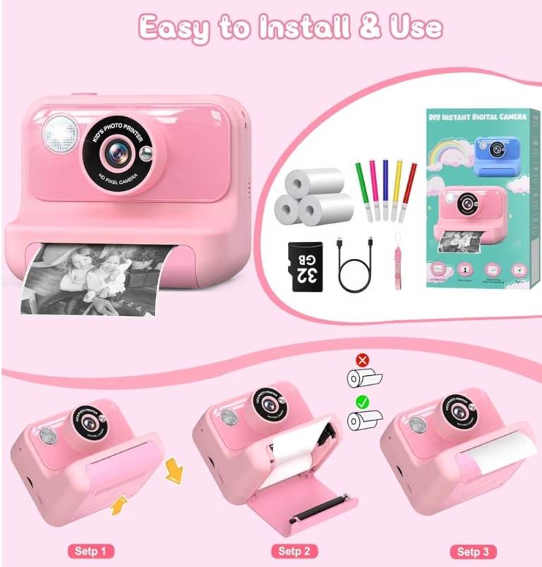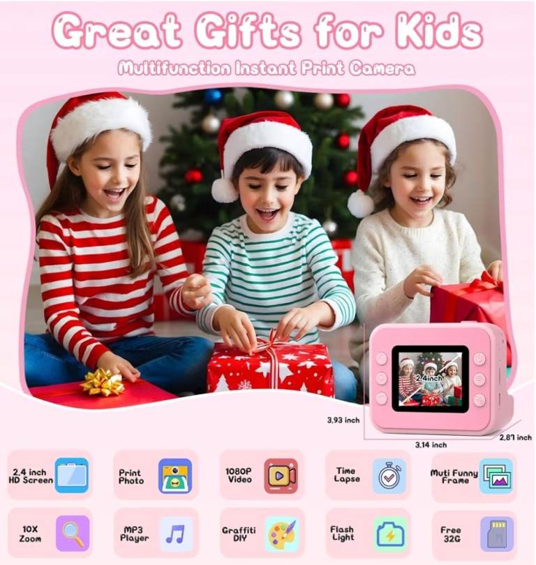 Kids Camera Instant Print, 2.4'' Instant Camera for Kids, 1080P Children Cameras with 32GB Card & 3 Rolls Photo Paper, Christmas Birthday Gifts Toys for Girls & Boys Aged 3-12 -Pink