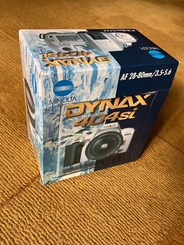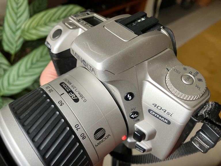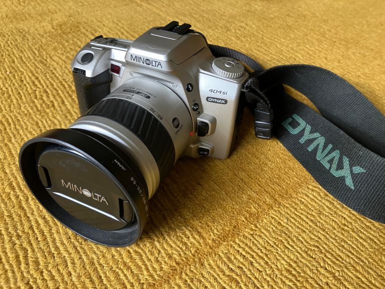 Minolta Dynax System - model 404si. With 28-80mm mini zoom lens (F3.5 - F5.6). Highly rated at the time of purchase and produces really sharp photographs due to the high quality lens.