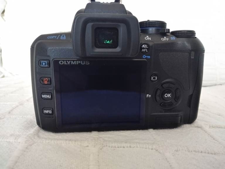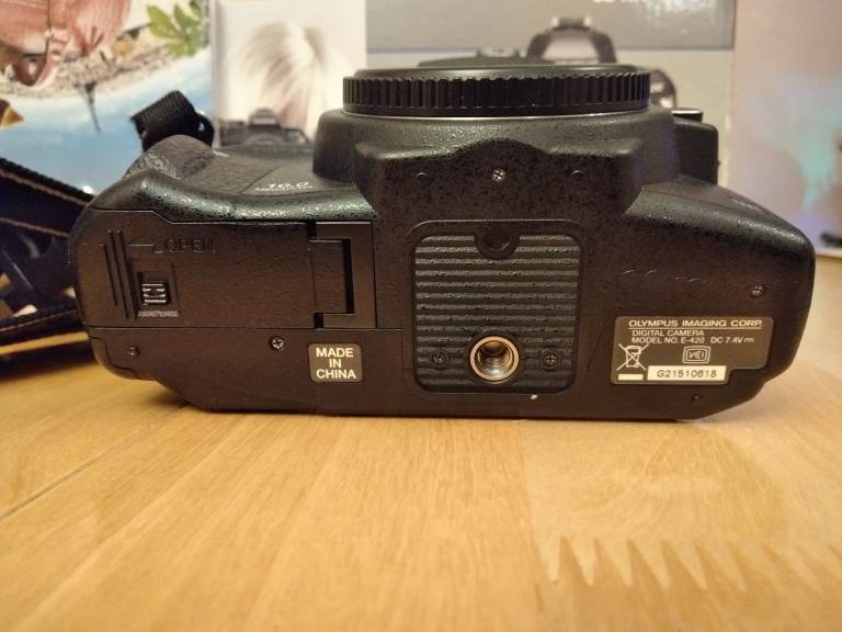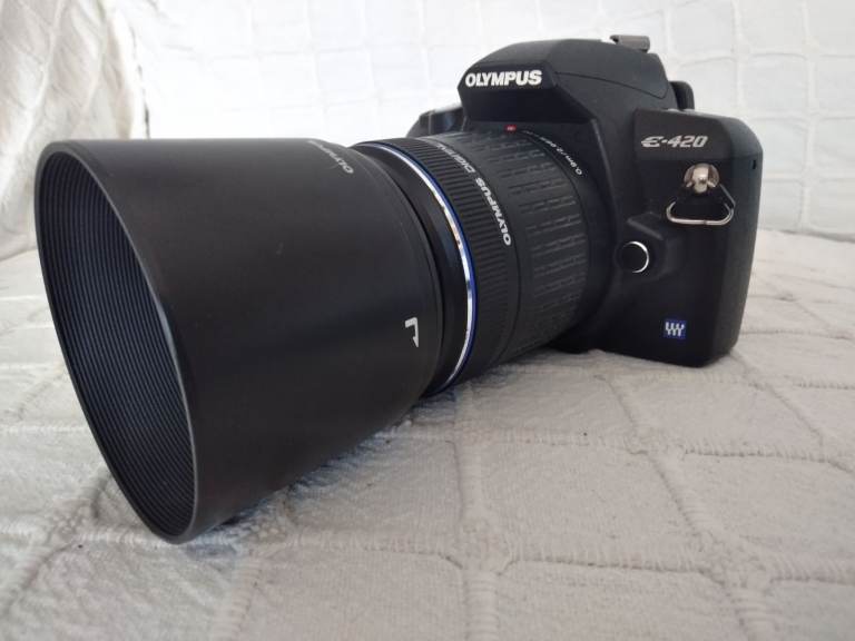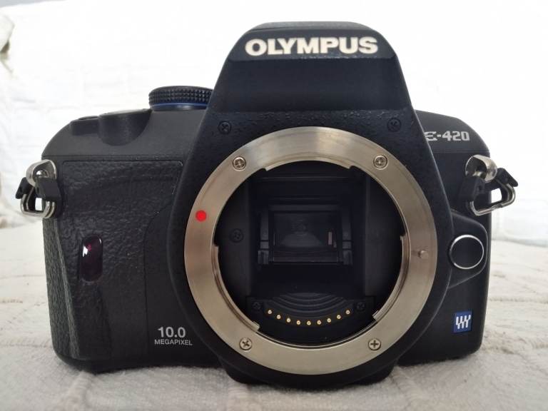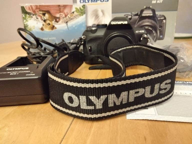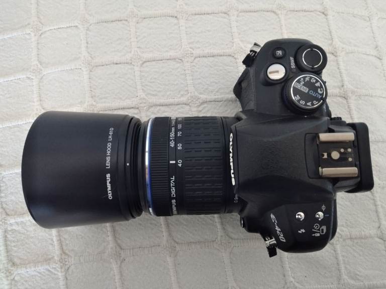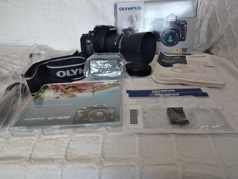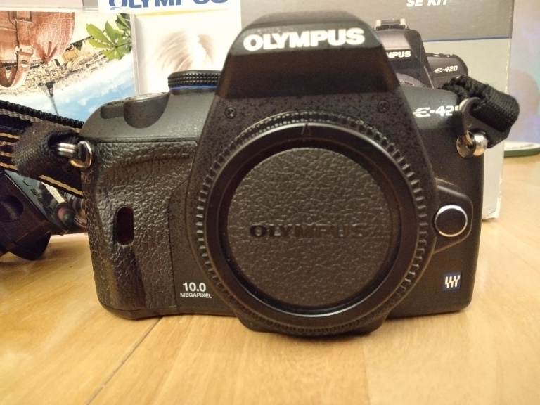 Olympus E420 camera body in good condition with low shutter count of under 4000 ,boxed with genuine strap , charger , battery and instructions . No scratches or damage,in full working order. Complete with Olympus Zuiko 40-150 lens including hood.
