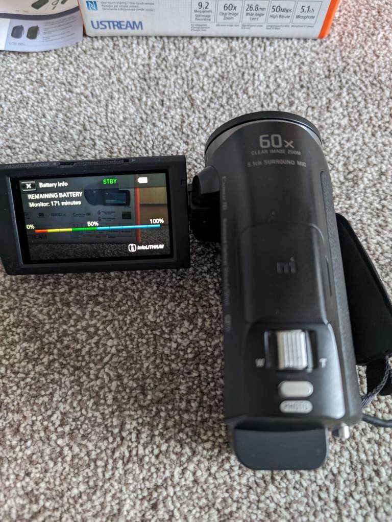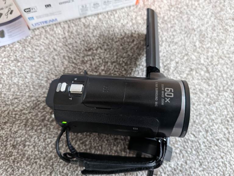 Very good condition overall. No usage marks on the body..Lens and viewing screen unmarked and no dust.. Records at 50fps with 5.1 surround audio..Has the benefit of a 3.5mm input for use with an external Microphone.