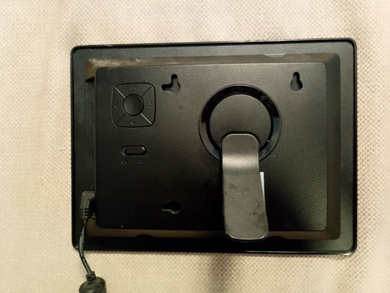 Black digital photo frame. Screen size is 14cm by 9cm, and the full frame size is 20cm by 15cm. Has a detachable leg so it can stand on its own, or the stand can be removed so it can be hung on a wall. Photos can be added via USB or by SD card.