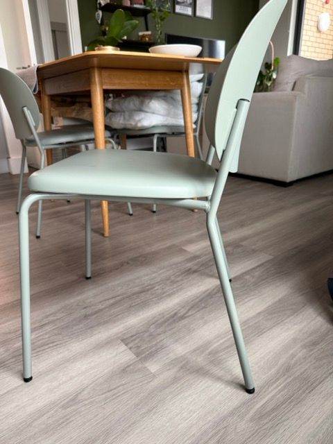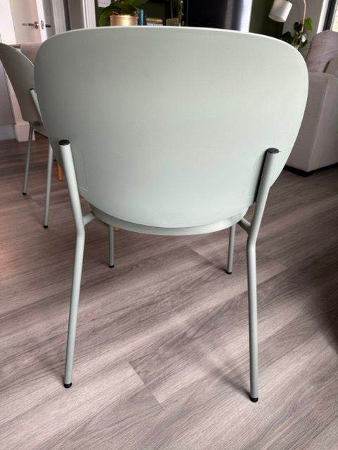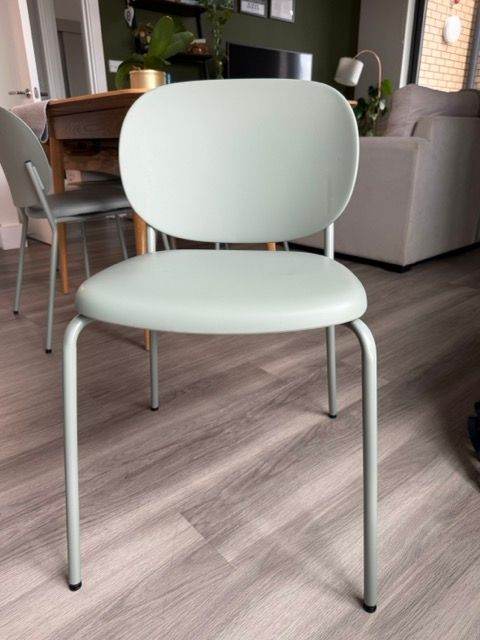2x Dining Chairs in Sage green available for purchase. Originally bought from La Redoute (£70 each), these chairs have only 2 years of use and are in pristine condition - no scratches, scruffs or marks. Lightweight and stylish, these are the perfect way to modernise your home. They're practical and easy to store, making them ideal for occasional seating, too. Dimensions are: H 80cm x W 44cm x D 50cm. The seat and backrest are made of durable plastic, and the frame is steel.