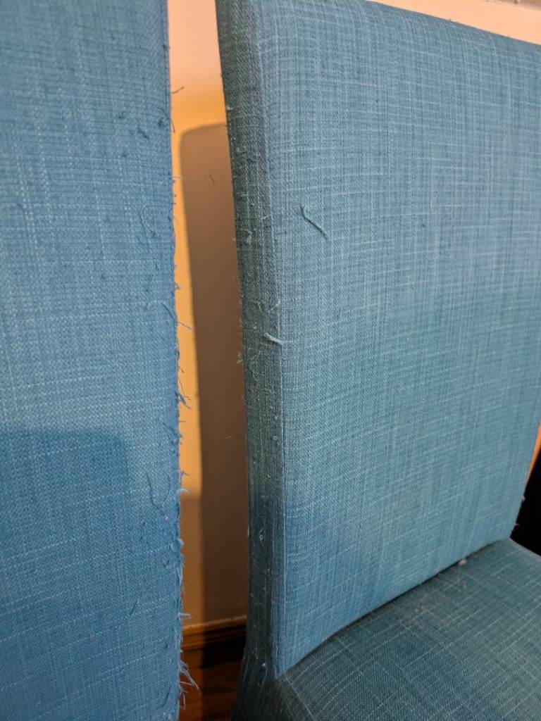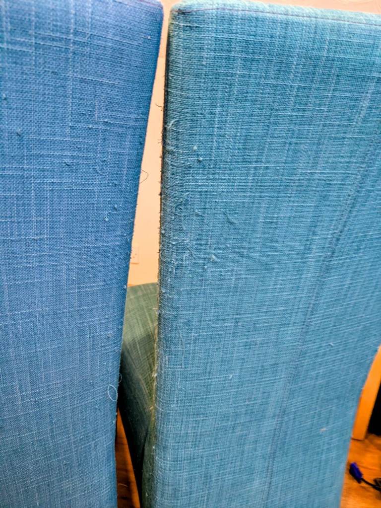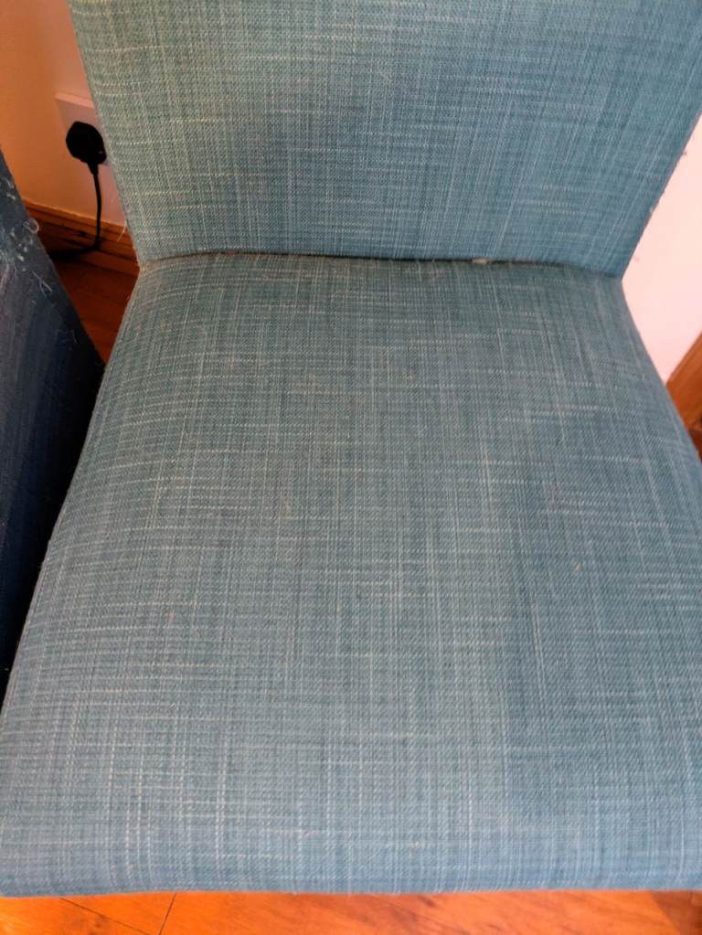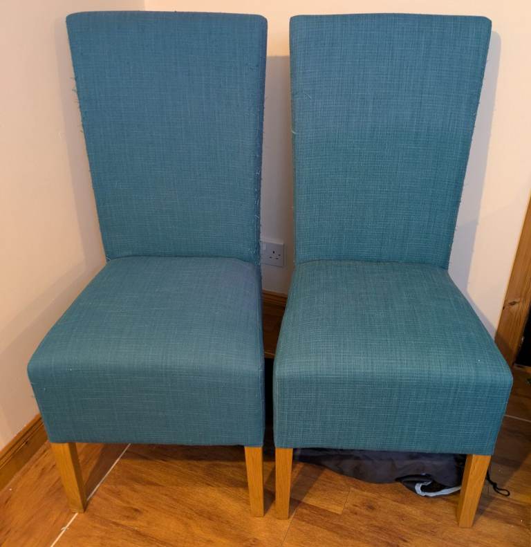 2x teal dining room chairs. Still comfy to sit on and not broken, however the chairs have been used as cat posts over time so are plucked quite a bit on the sides as per photos. One chair slightly faded from sunlight compared to the other.