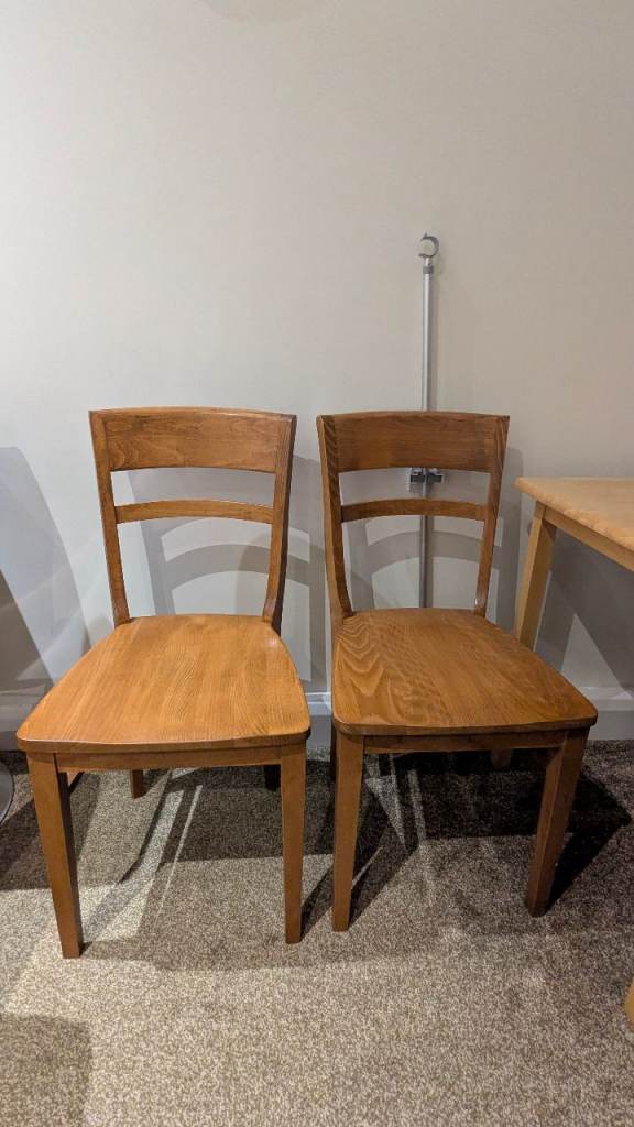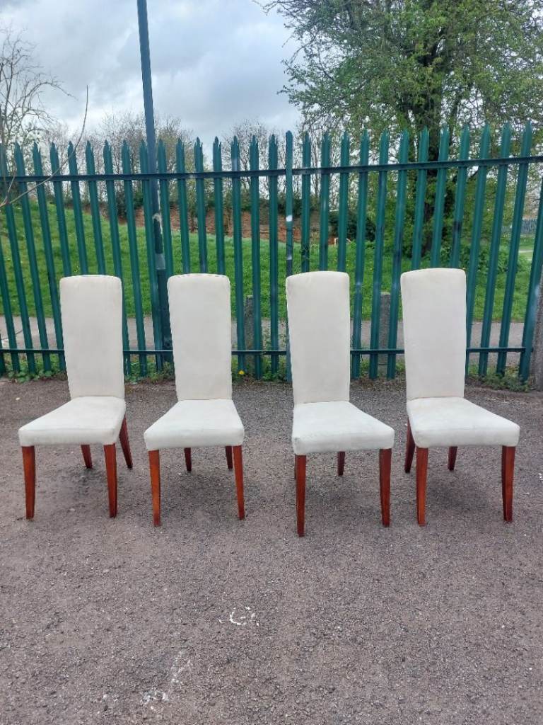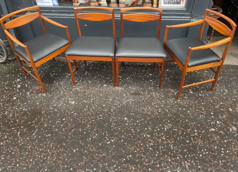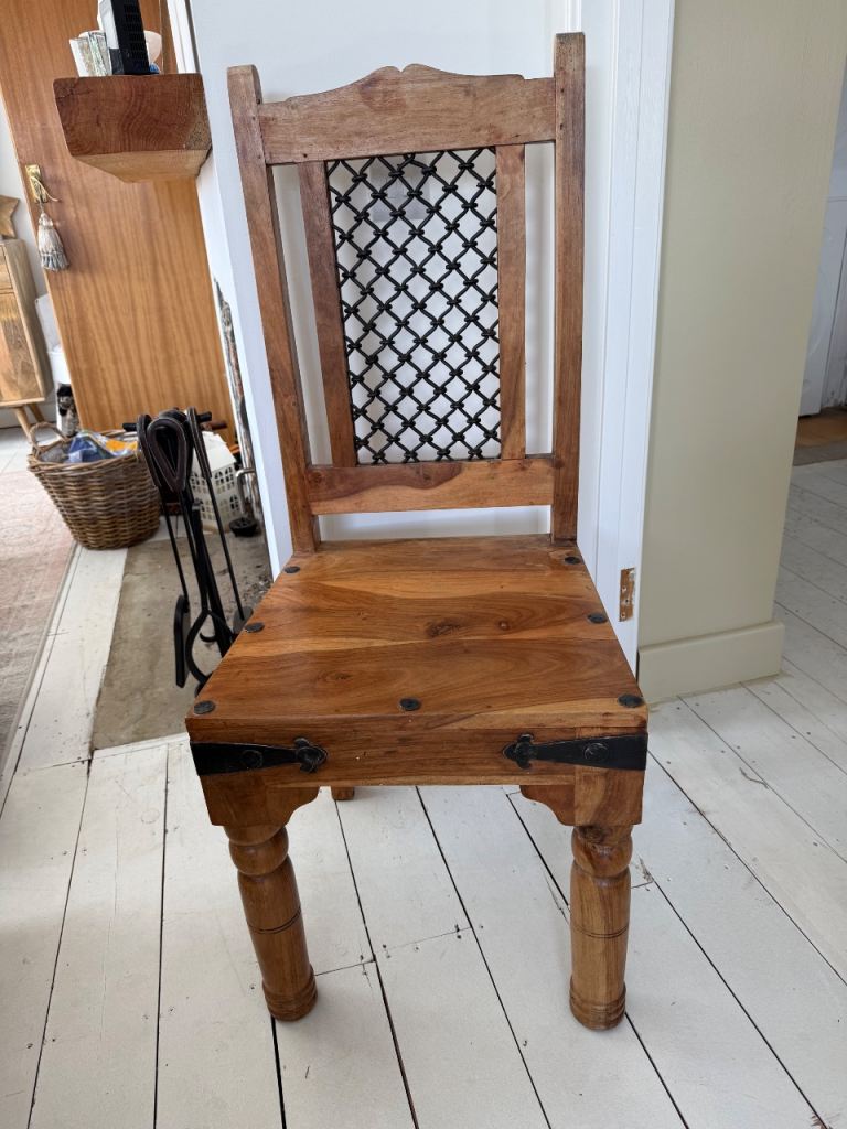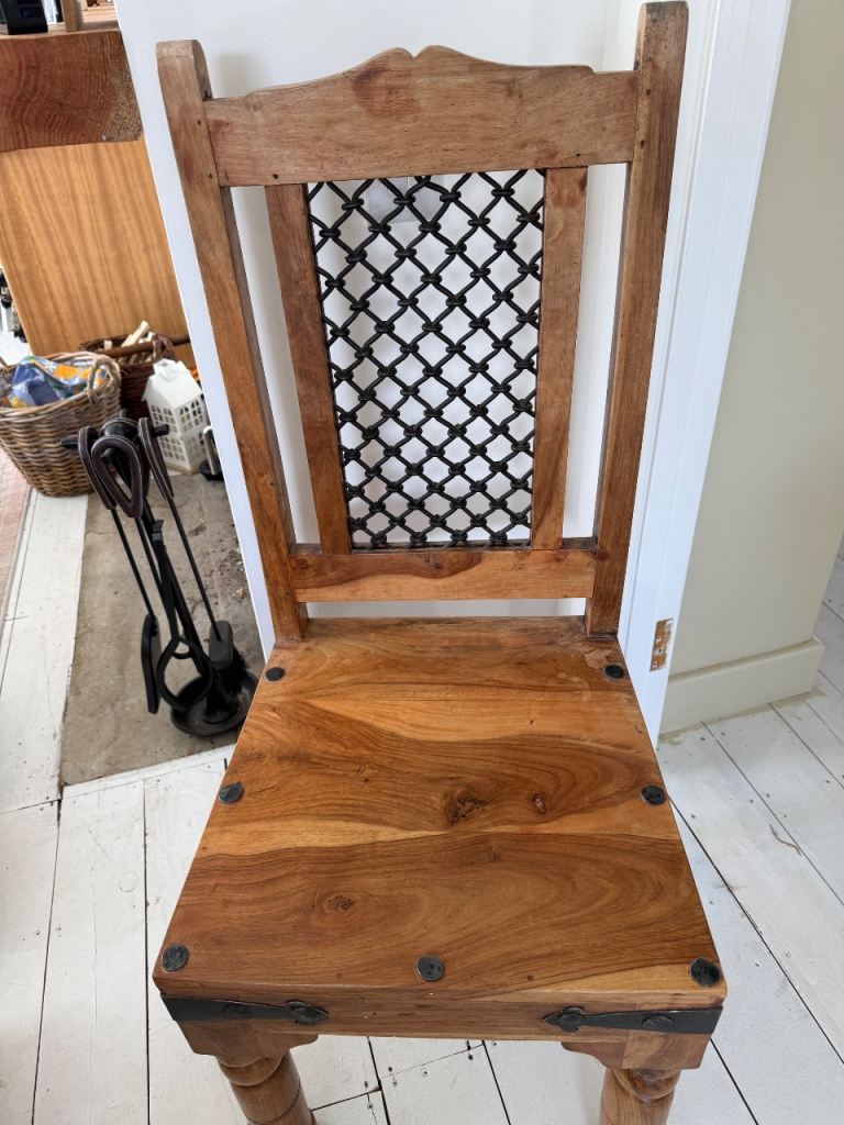 Hand made dining chairs. Therefore each is unique and the 4 create a love set of dining chairs. Very solid no, wobbly legs. The backs have a black metal detailing.