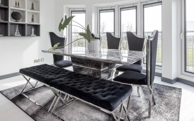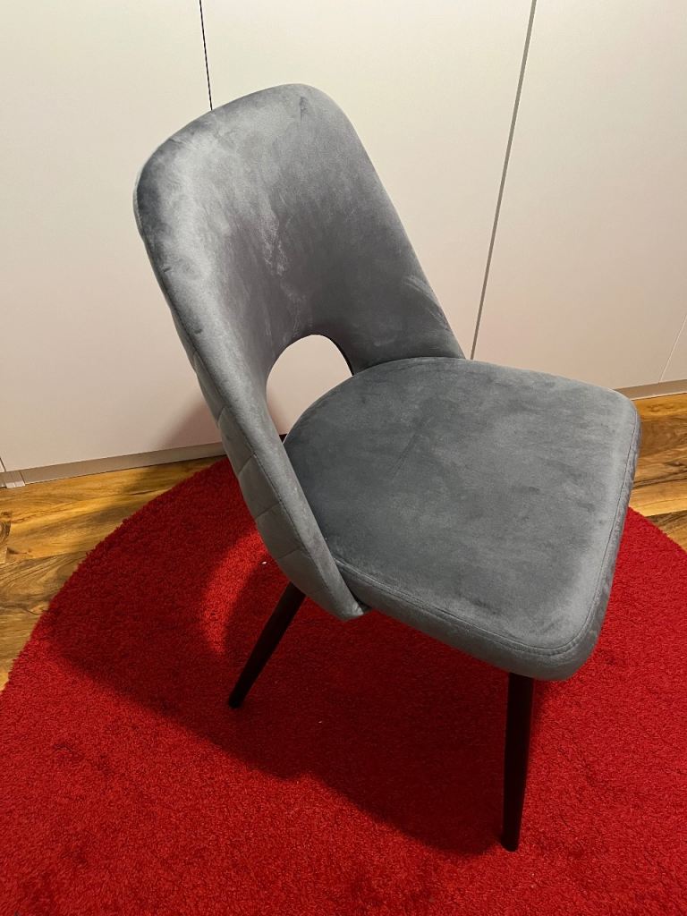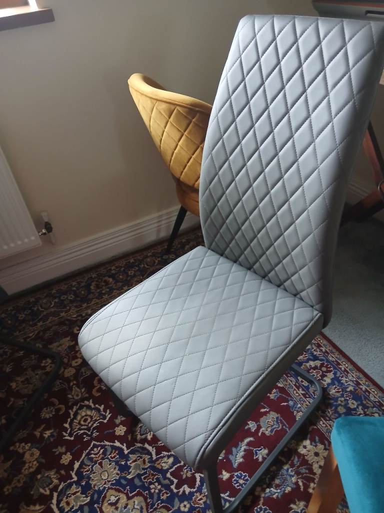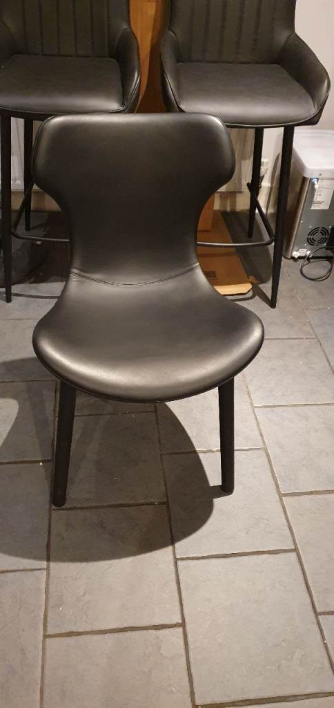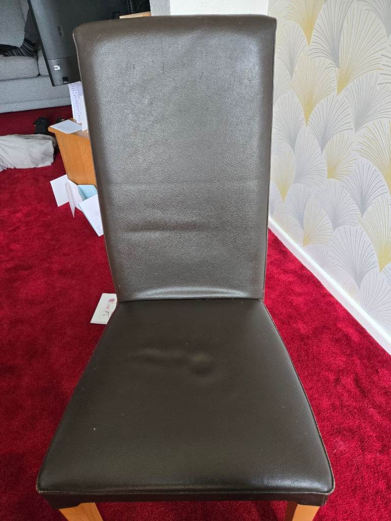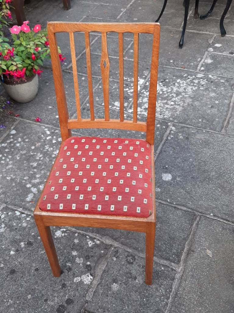 Hand made dining chairs. Therefore each is unique and the 4 create a love set of dining chairs. Very solid no, wobbly legs. The backs have a black metal detailing.