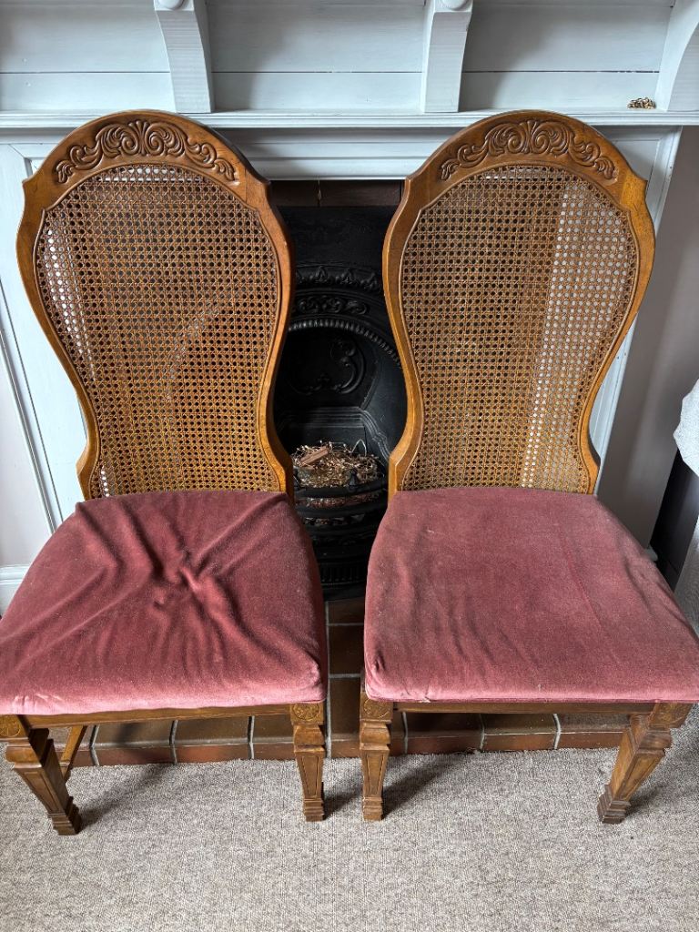 Made from solid beech with rattan backs (all in an excellent condition). There is carved detailing on the back rest and chair legs.