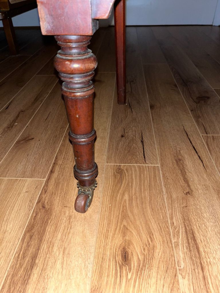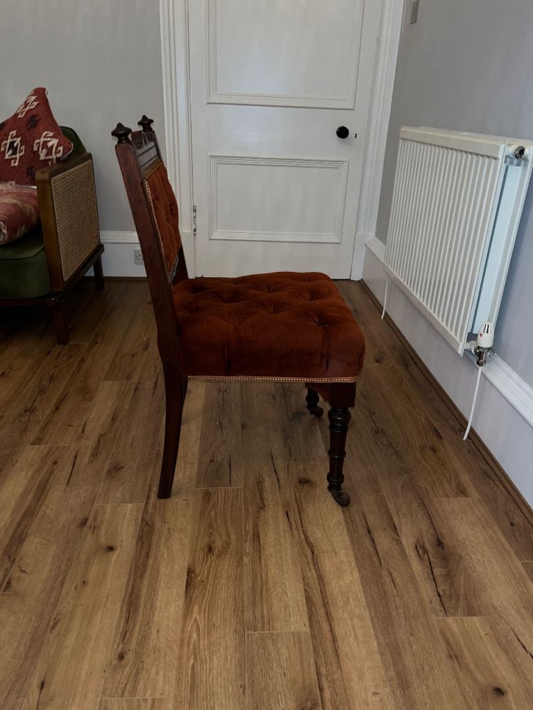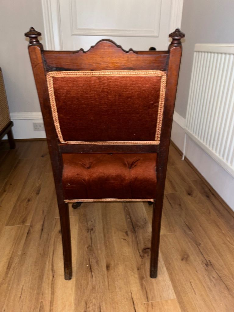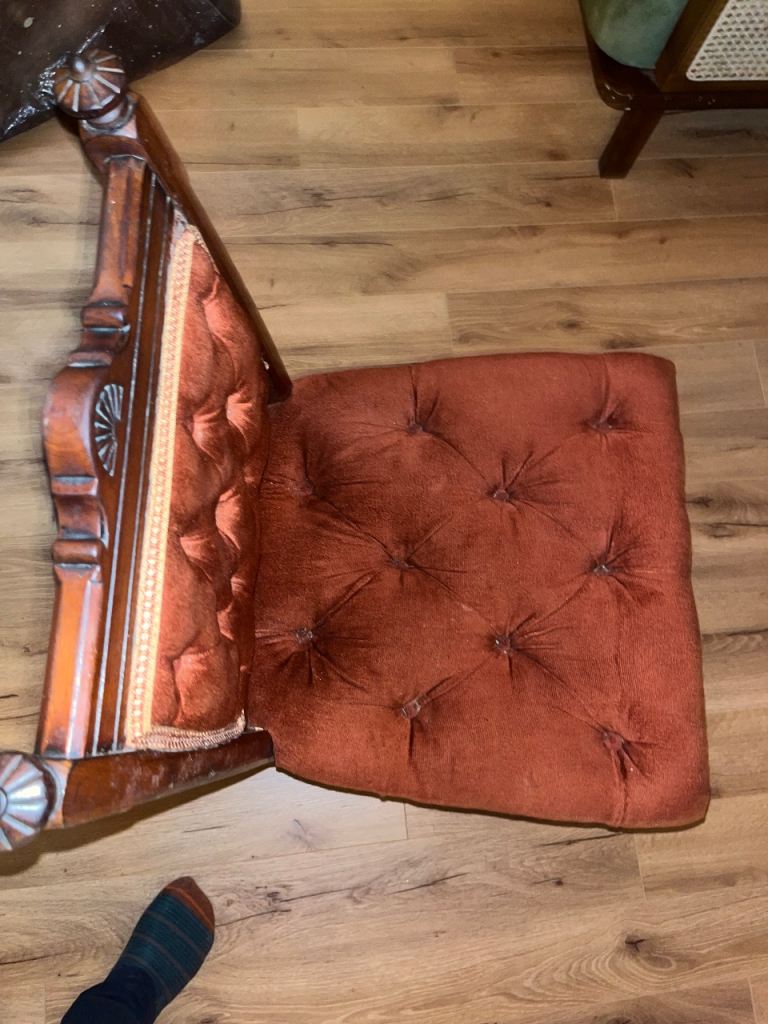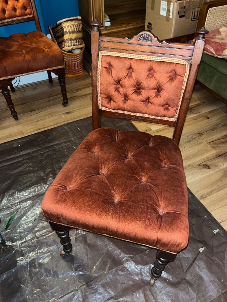 Antique chairs recently upholstered in rust velvet buttoned and padded .