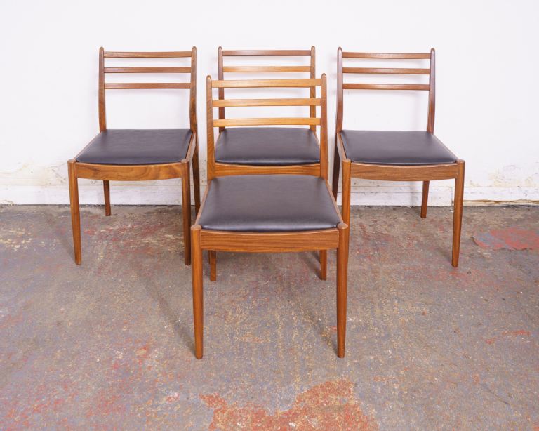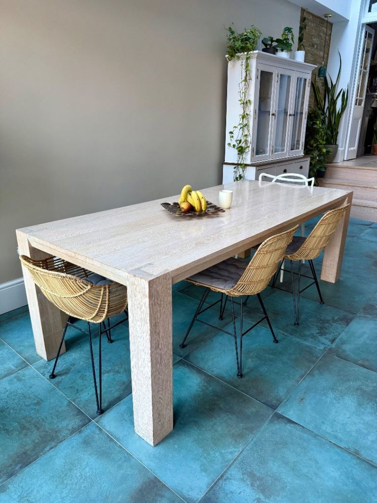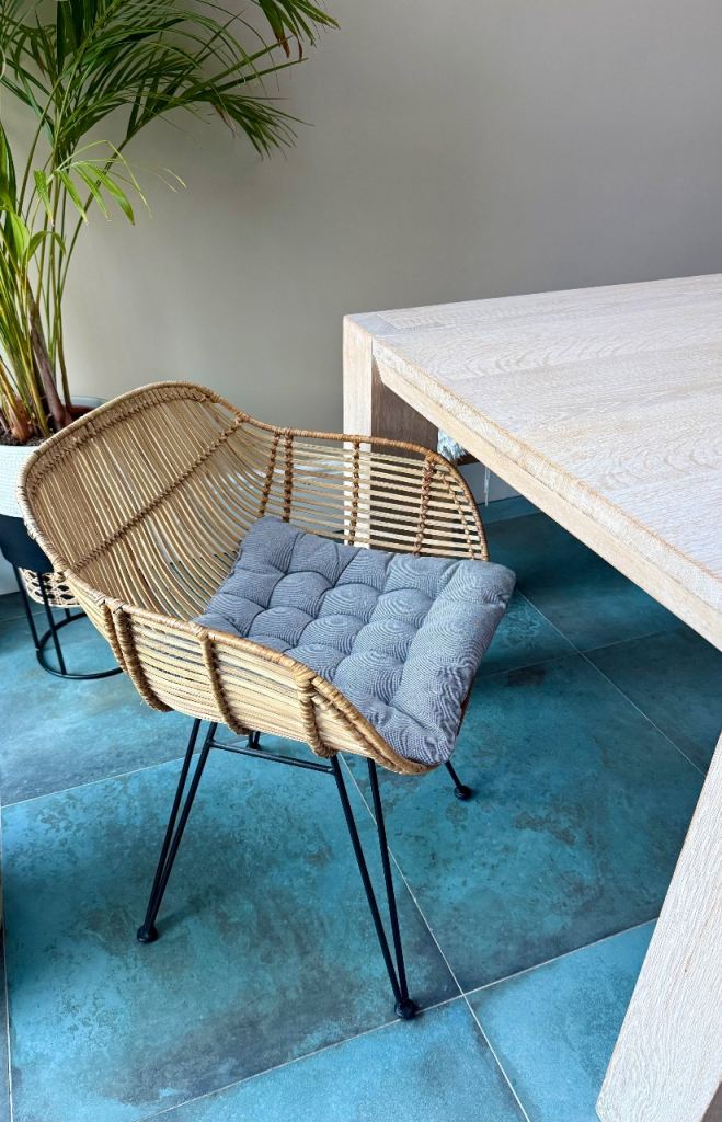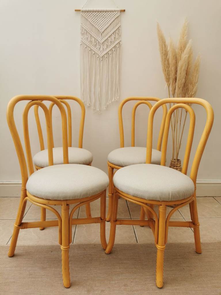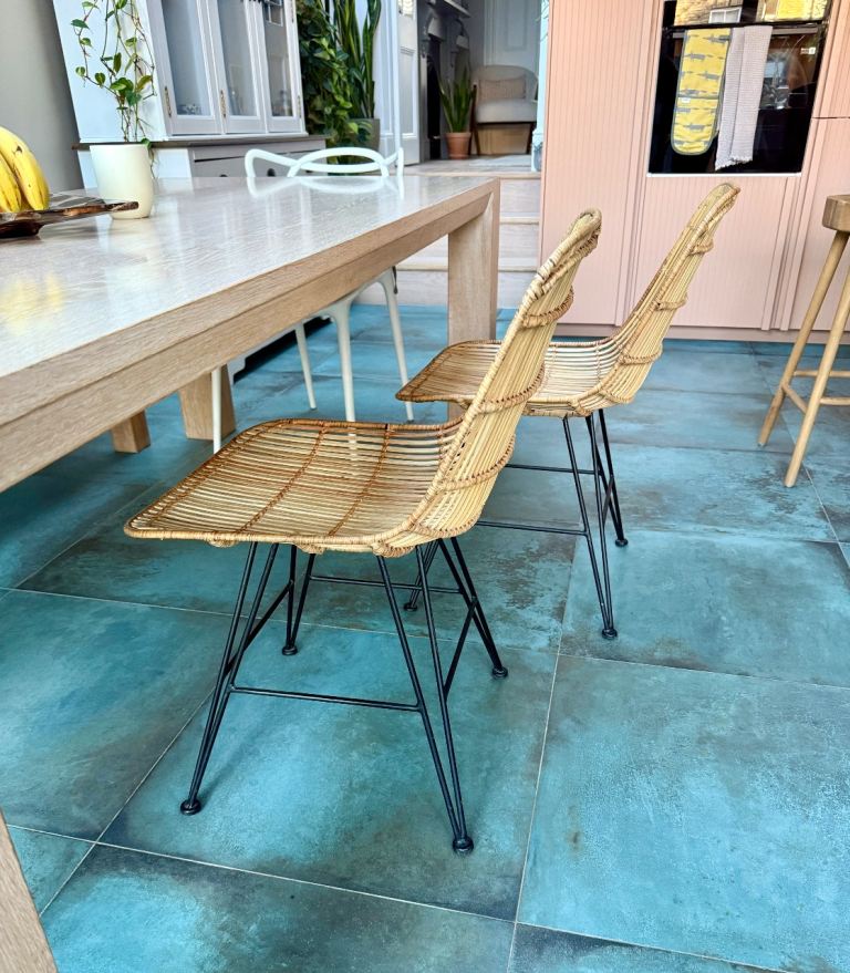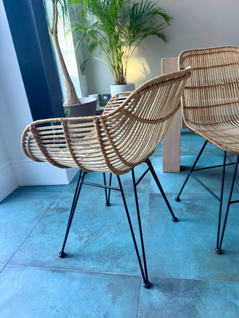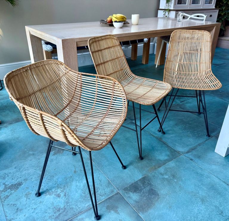 Three fully assembled Cox & Cox Rattan Chairs. Modern style rattan design in natural bamboo colour with sturdy black iron legs.