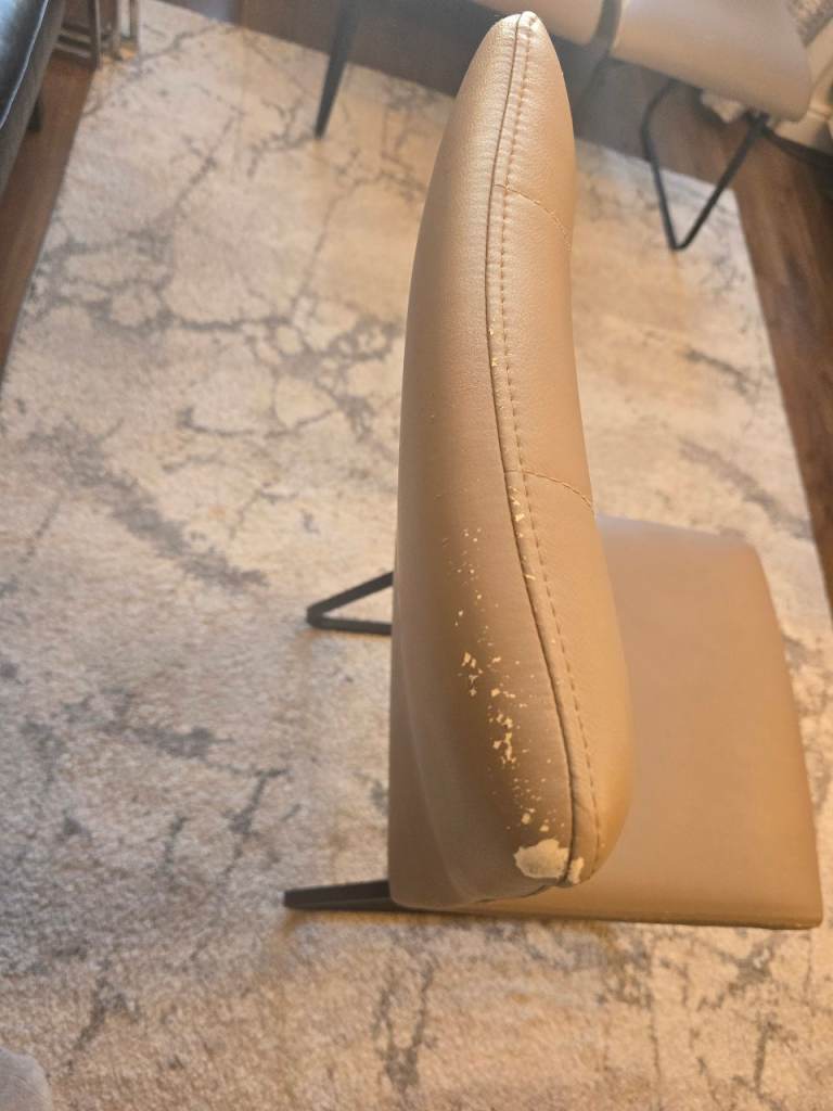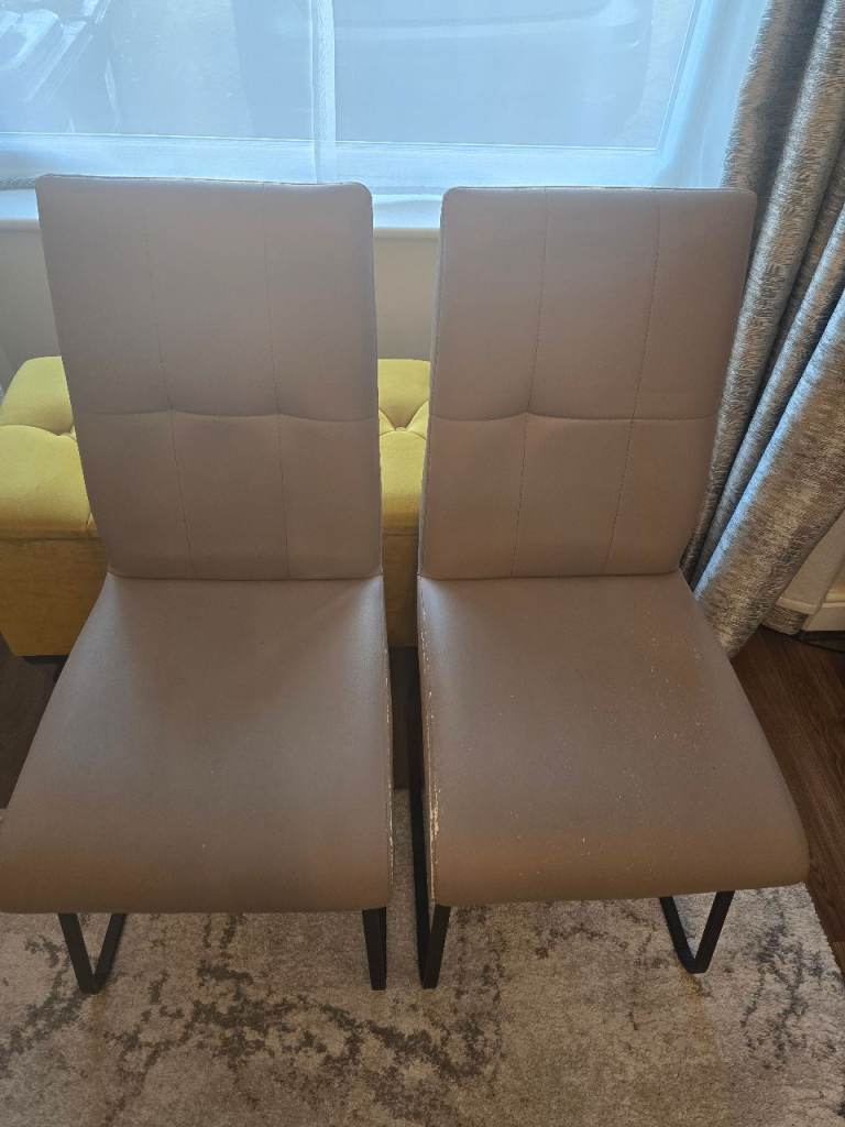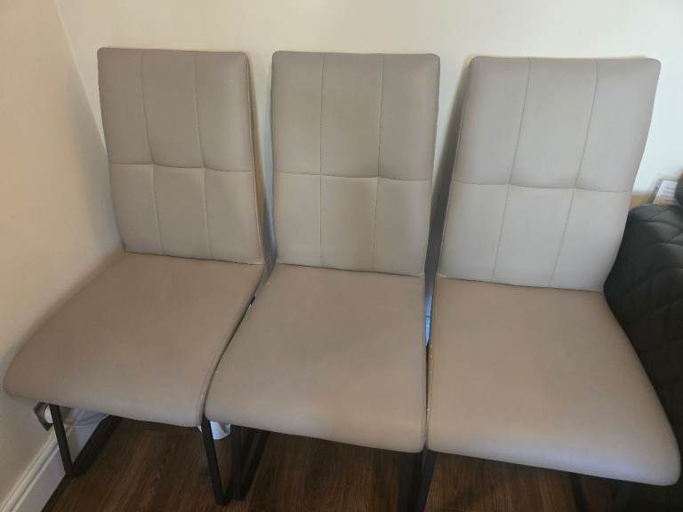 Selling a set of 6 modern dining chairs in beige faux leather and black legs.