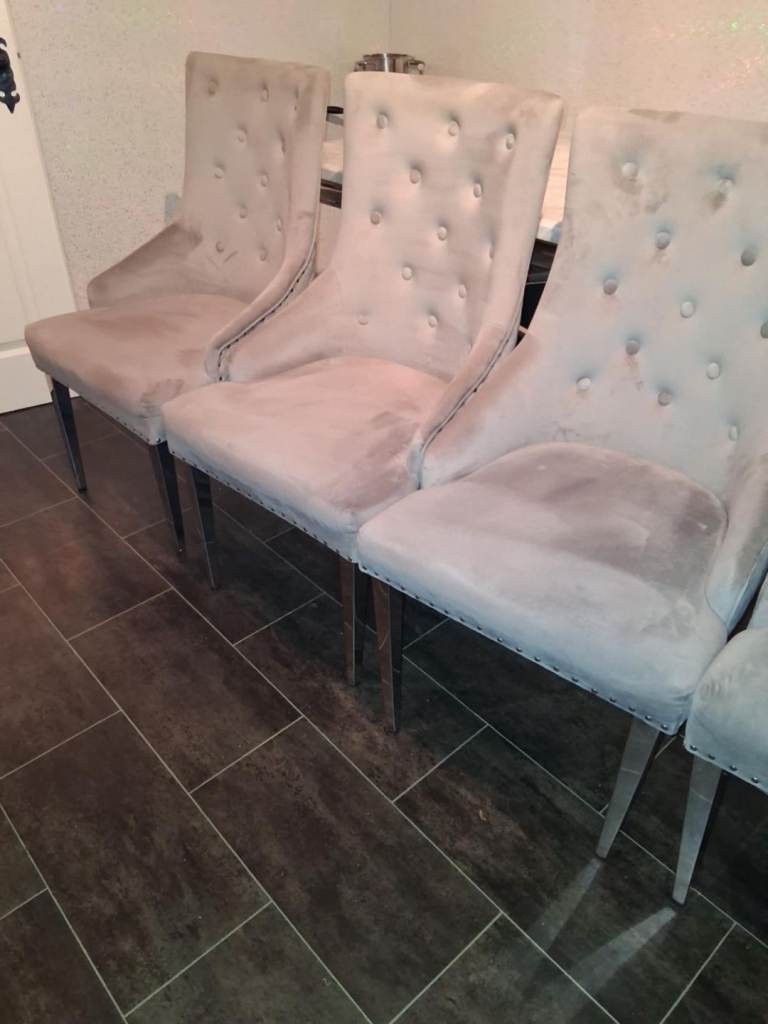 Set of 4 grey dining chairs with silver knockers and studding the chairs are in very good condition my new chairs have arrived so I have priced these chairs cheap for quick sale contact anytime thanks for looking