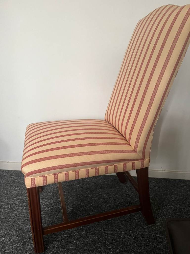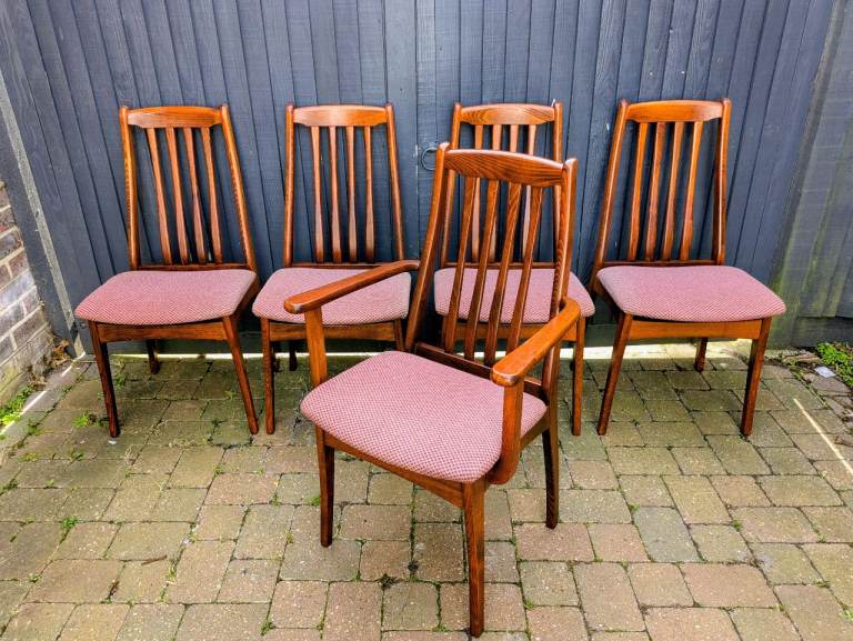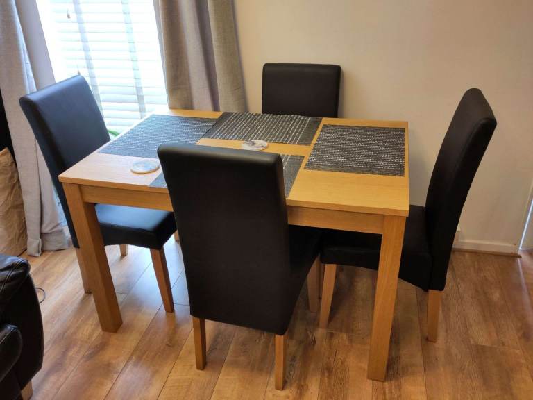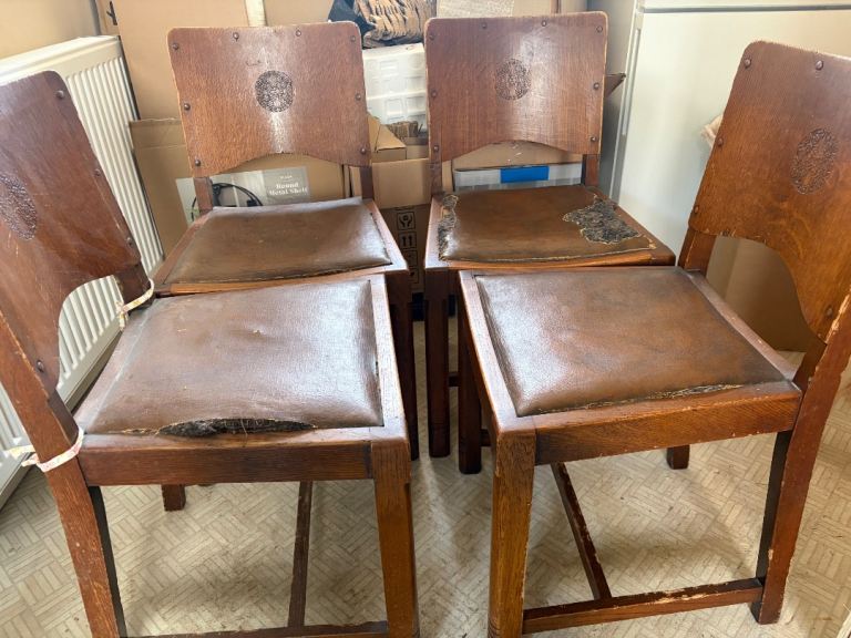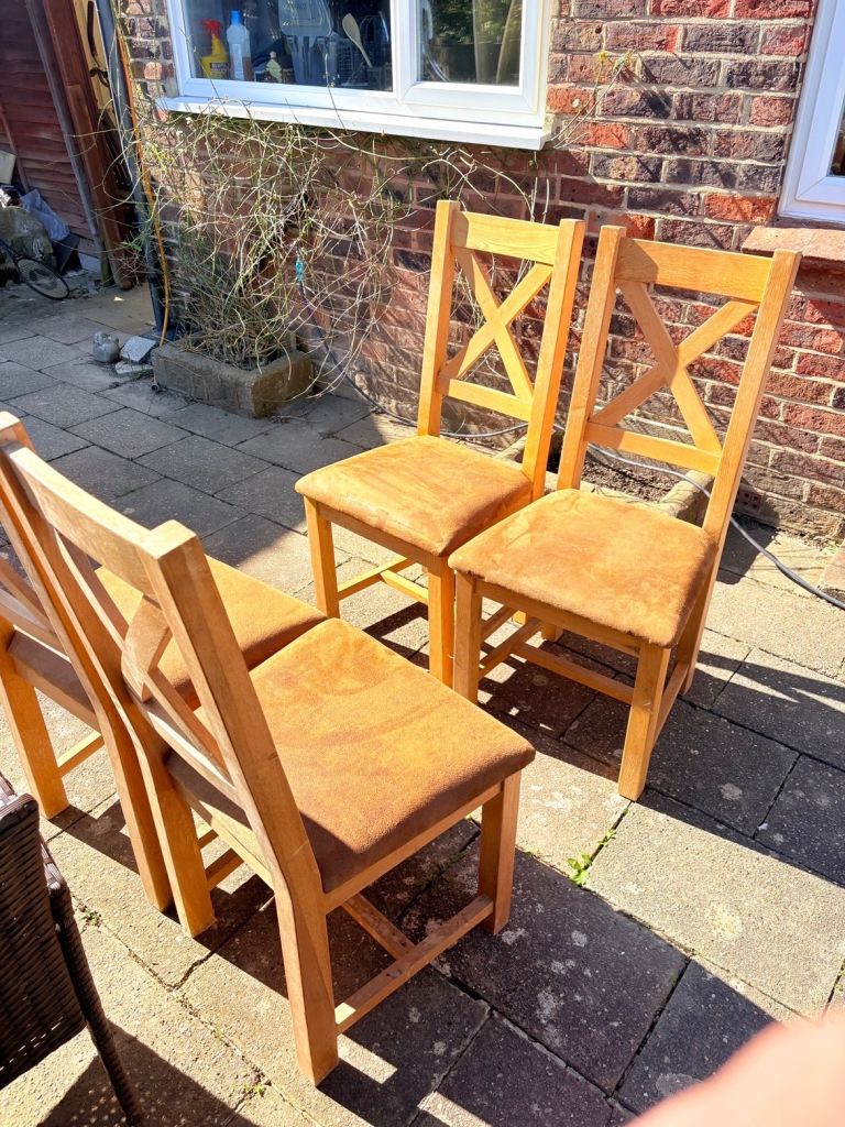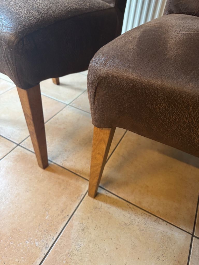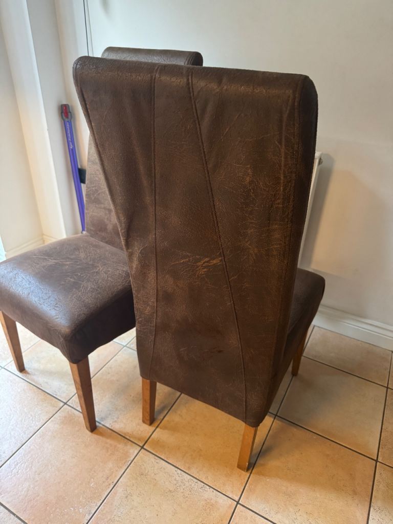 Two high back dining chairs, brown faux suede, oak frame/ legs. In good condition. Priced for quick sale. £20 for both.