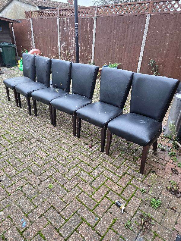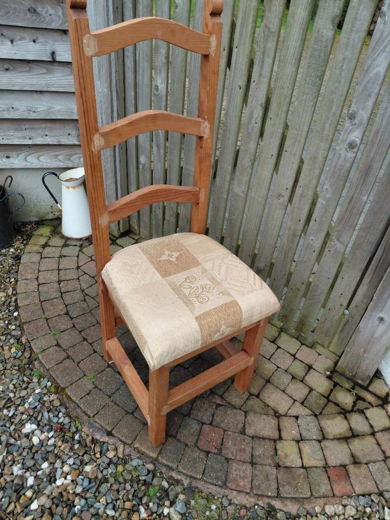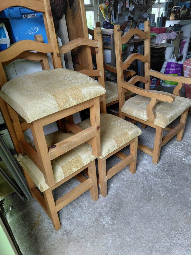 6 really good, strong Pine dining room chairs. All are soft covered and 2 of them have support arms.