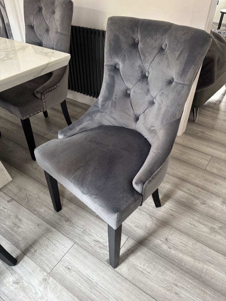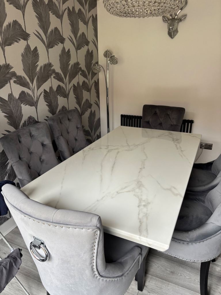 Heavy marble effect resin table 1800/900 six grey velour chairs