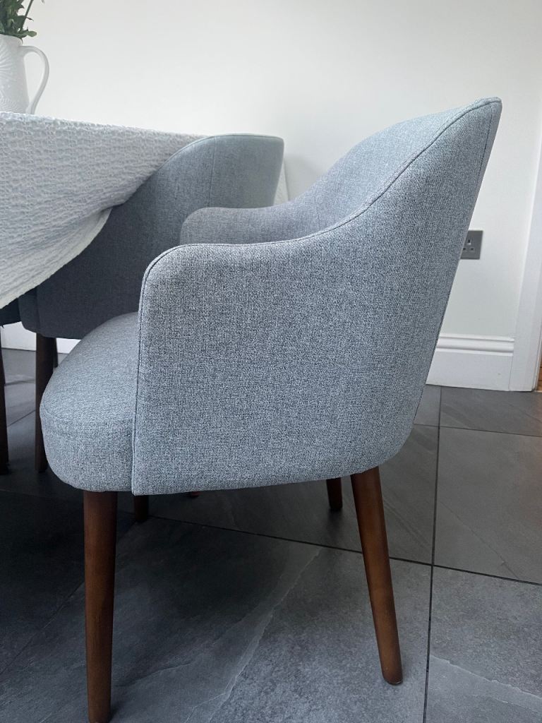 Set of 4 Swinton Carver Dining Chairs from Made. Mountain Grey with Mahogany stained legs.