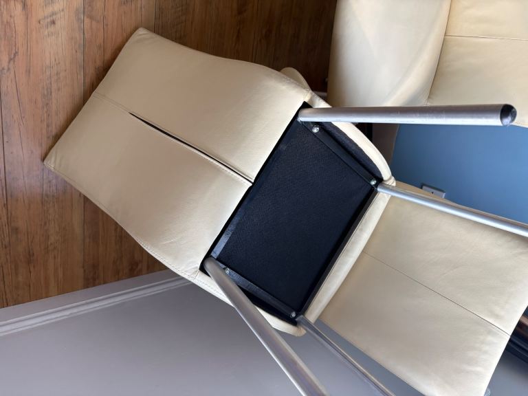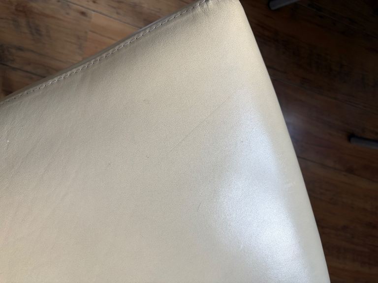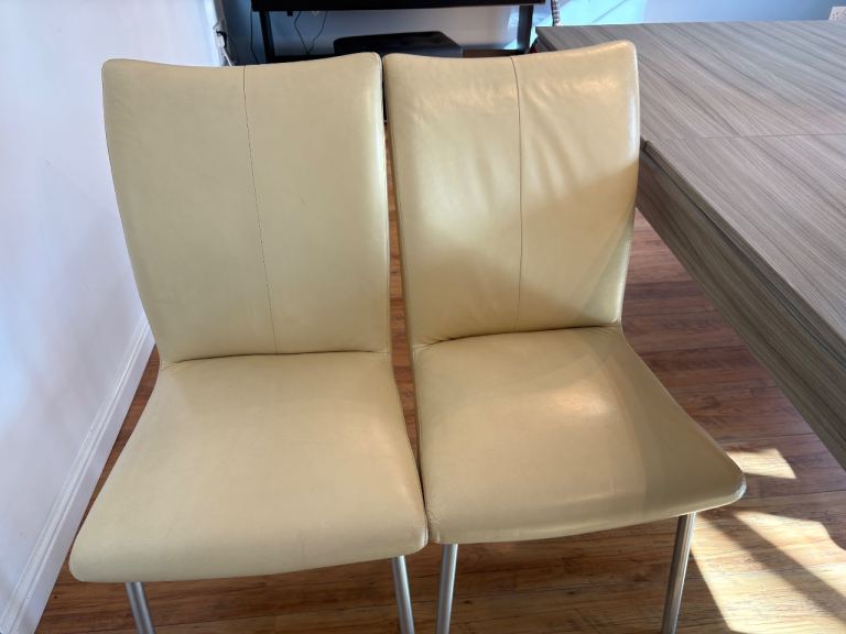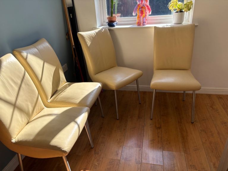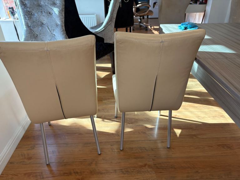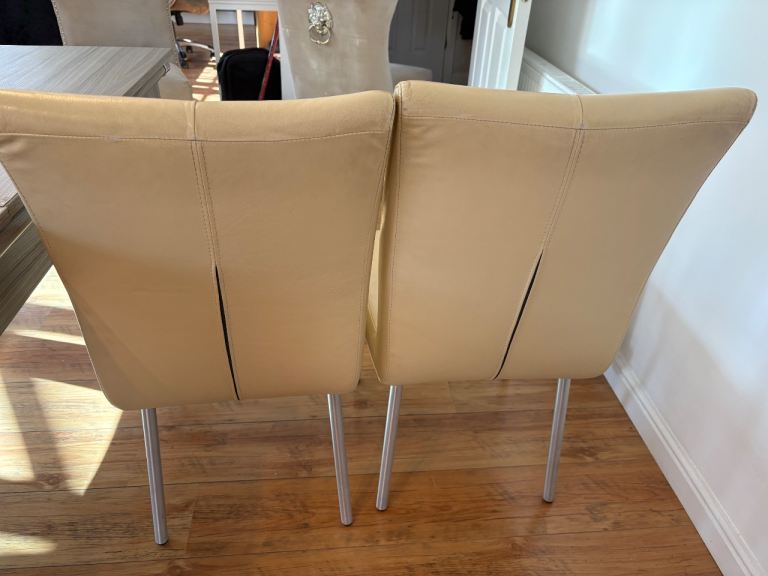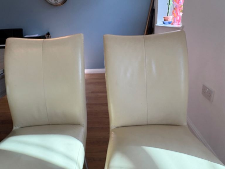 Cream genuine leather Barker and Stonehouse dining room chairs . All chairs have a small scuff on back of chair where they have been against a wall in my poolroom.