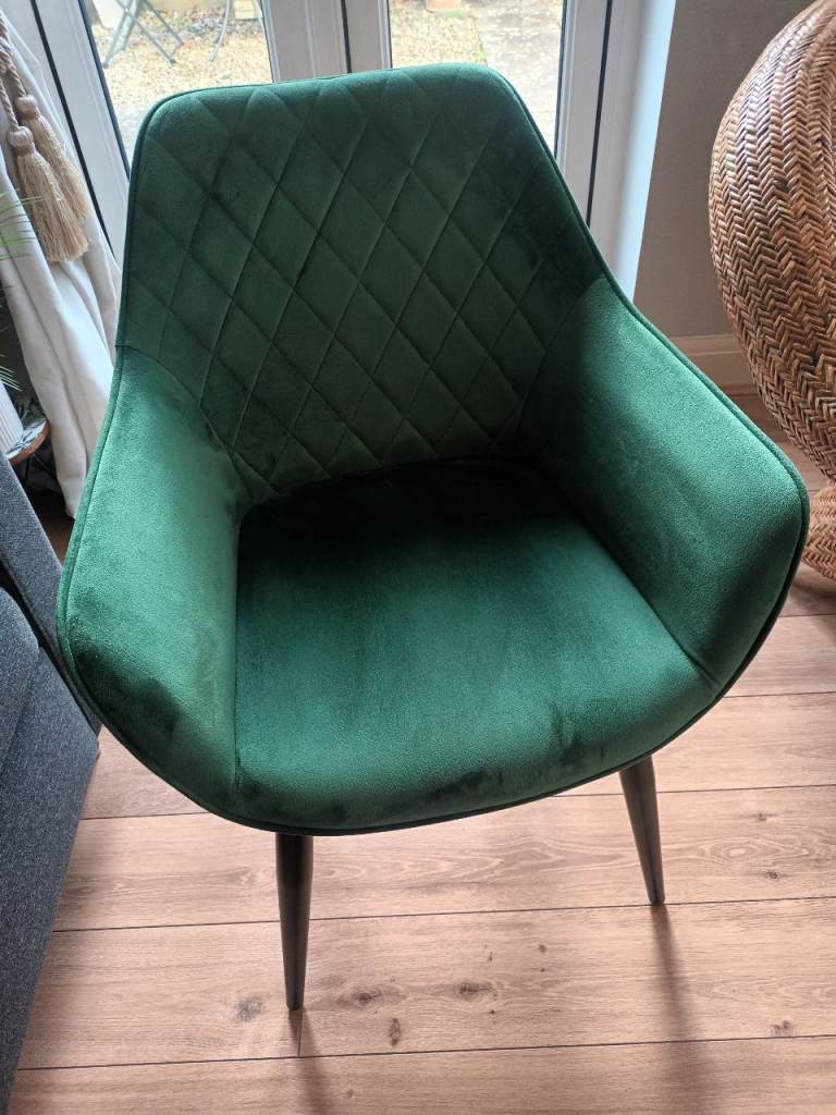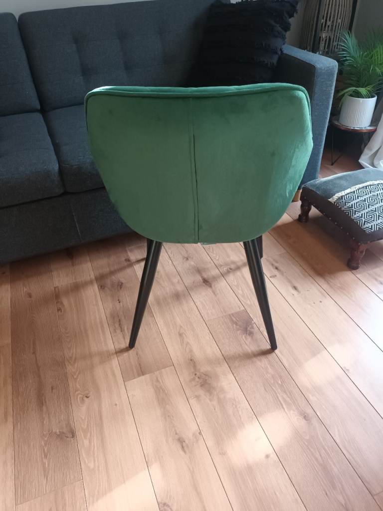 Green velvet chair with black legs. We used it as a dressing table chair. Could be used as a dining chair, bedroom chair etc. Only selling as moved house and no longer needed. From a smoke and pet free home.